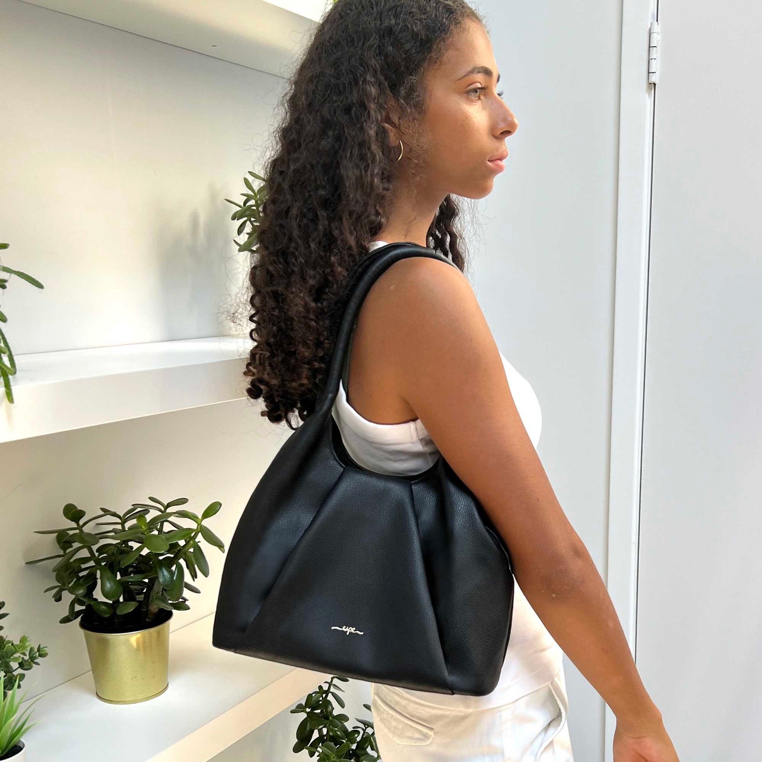 This sophisticated medium size classic boho shoulder bag in soft pebbled vegan leather has multiple compartments and a modern fold detail on the front. The Ashely is the perfect everyday bag that is spacious and stylish.