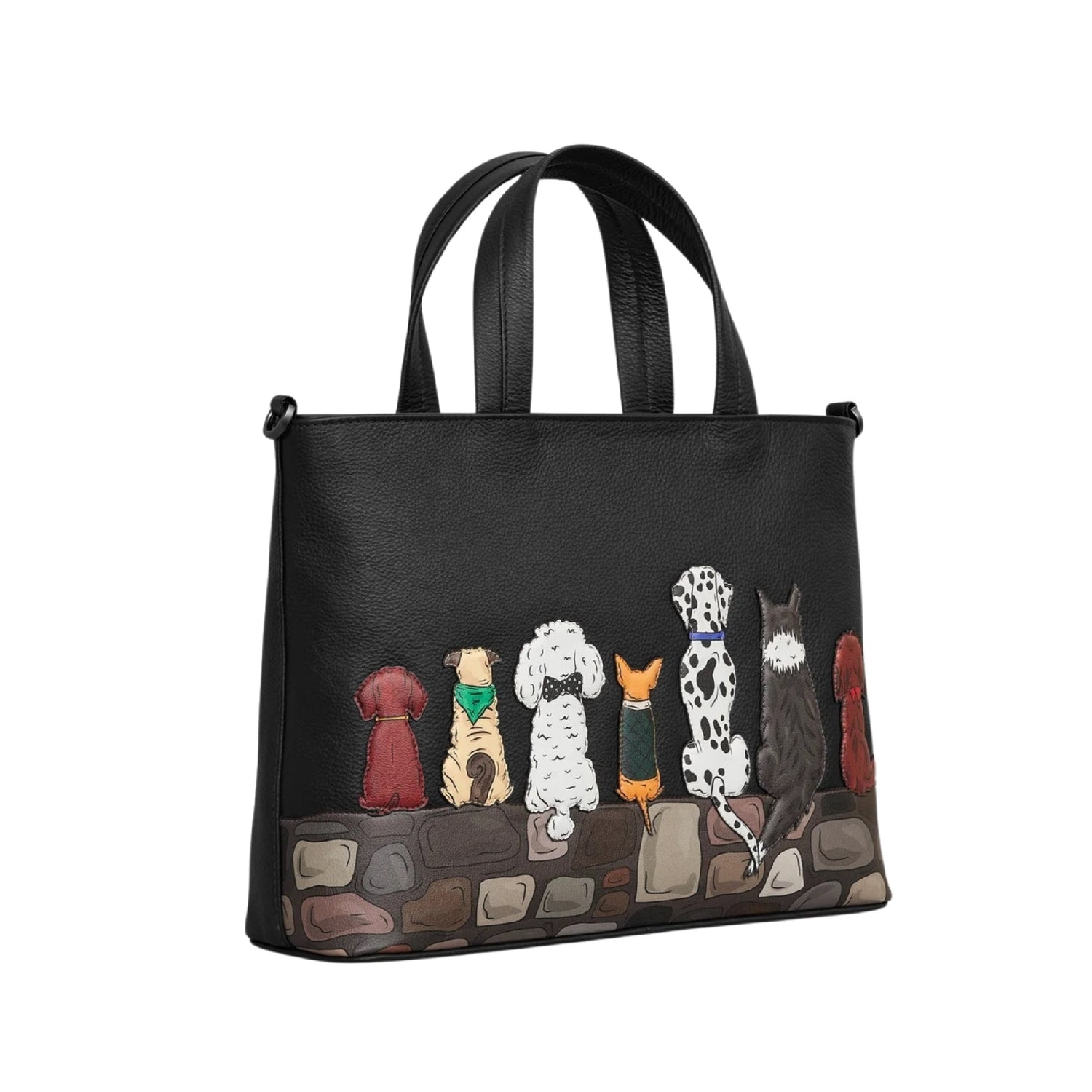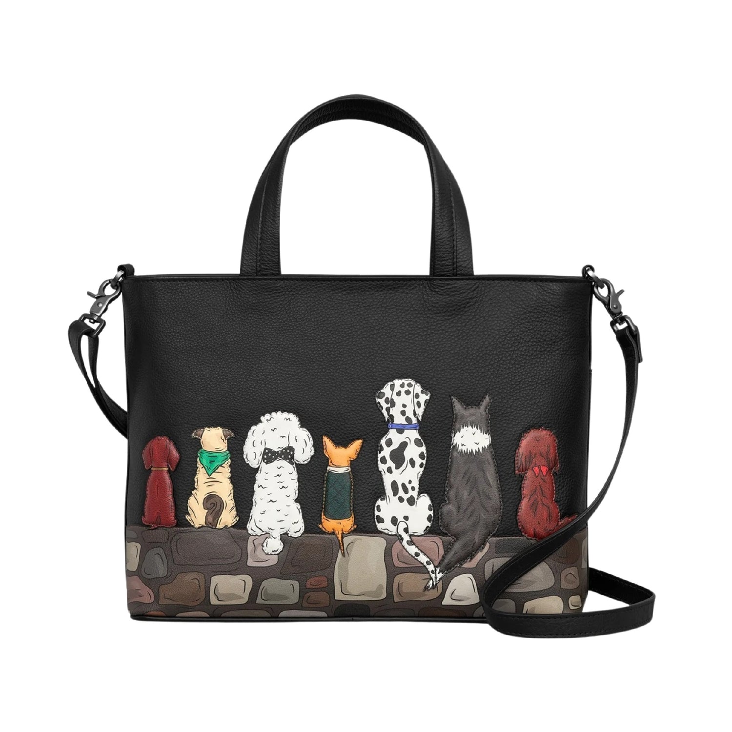 Our favourite multiway grab bag has been finished in a textured black leather to accentuate the colourful appliques on the front. This curious rabble of canine companions feature our favourite four-legged friends such as the Daschund, Pug, Poodle, Chihuahua, Dalmation, Border Collie and Spaniel. Here they sit on top of an old stone wall which adds further detail to this bag. The delicately drawn dogs on the front of this women’s leather grab handbag stir those feelings we have for our favourite four-legged friends and remind why we love to have them by our side. This multi-functional grab bag from Yoshi Goods features a detachable shoulder strap to offer more versatility and can worn different ways.