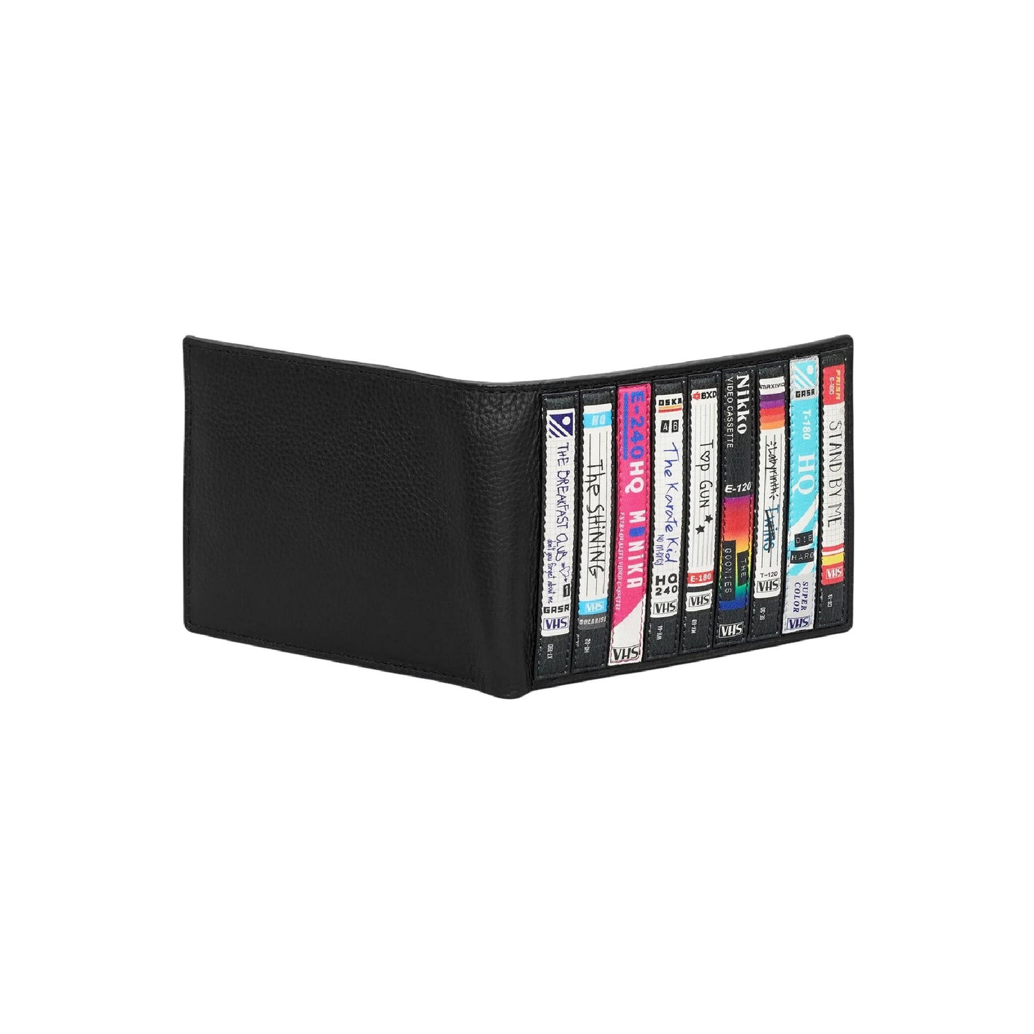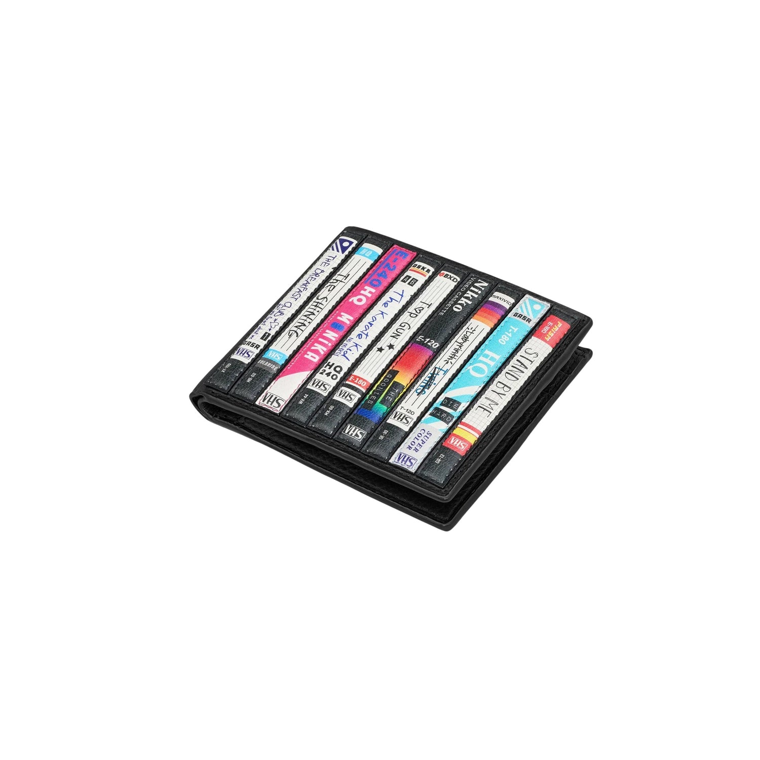 Time to get nostalgic with this men's leather wallet from Yoshi Goods featuring our Be Kind Rewind design. Vivid, technicolor VHS tapes add a bold pop of colour to the classic black leather on the front of this men's wallet. This two fold style with black inner has a classic look and space for your cards, coins, and notes, RFID Protection.