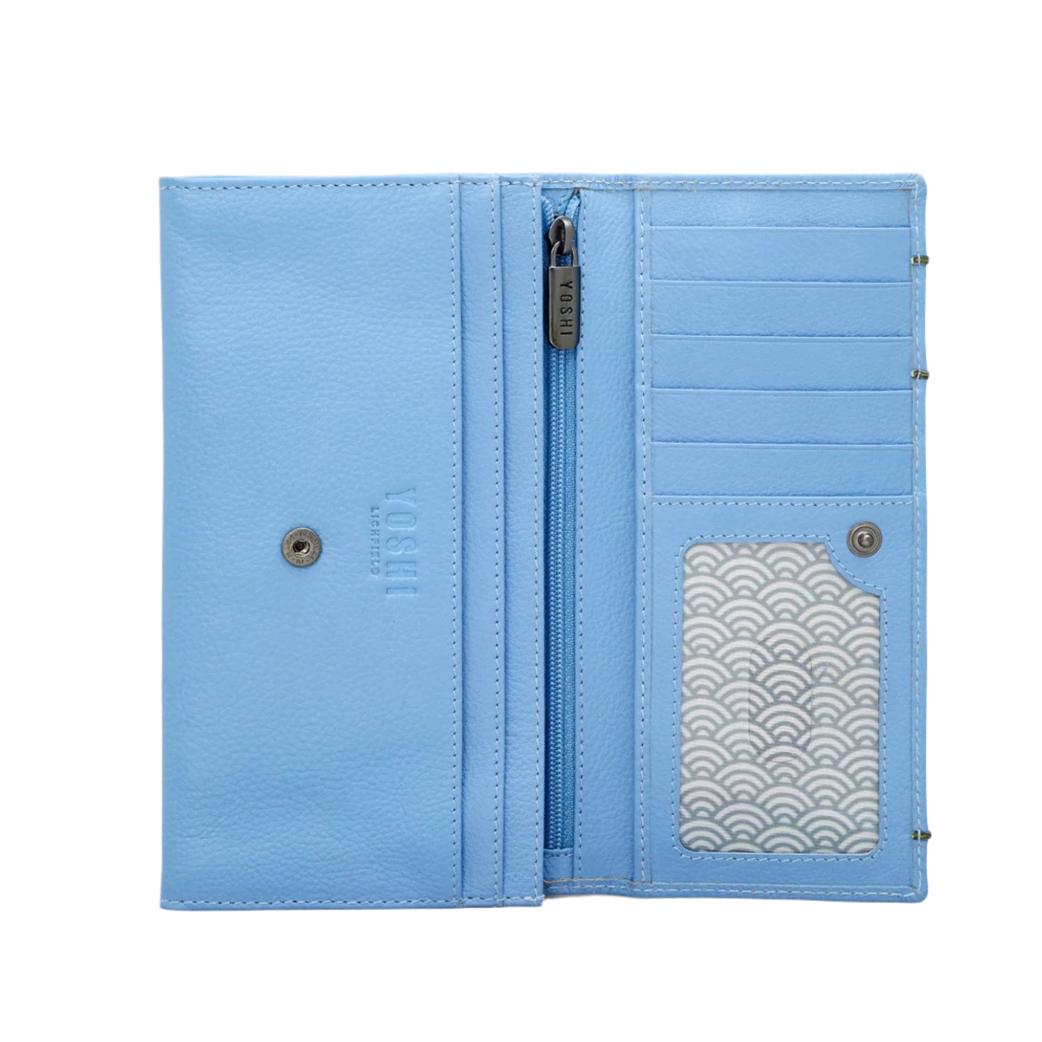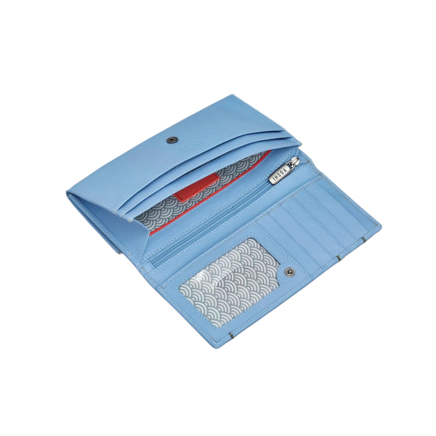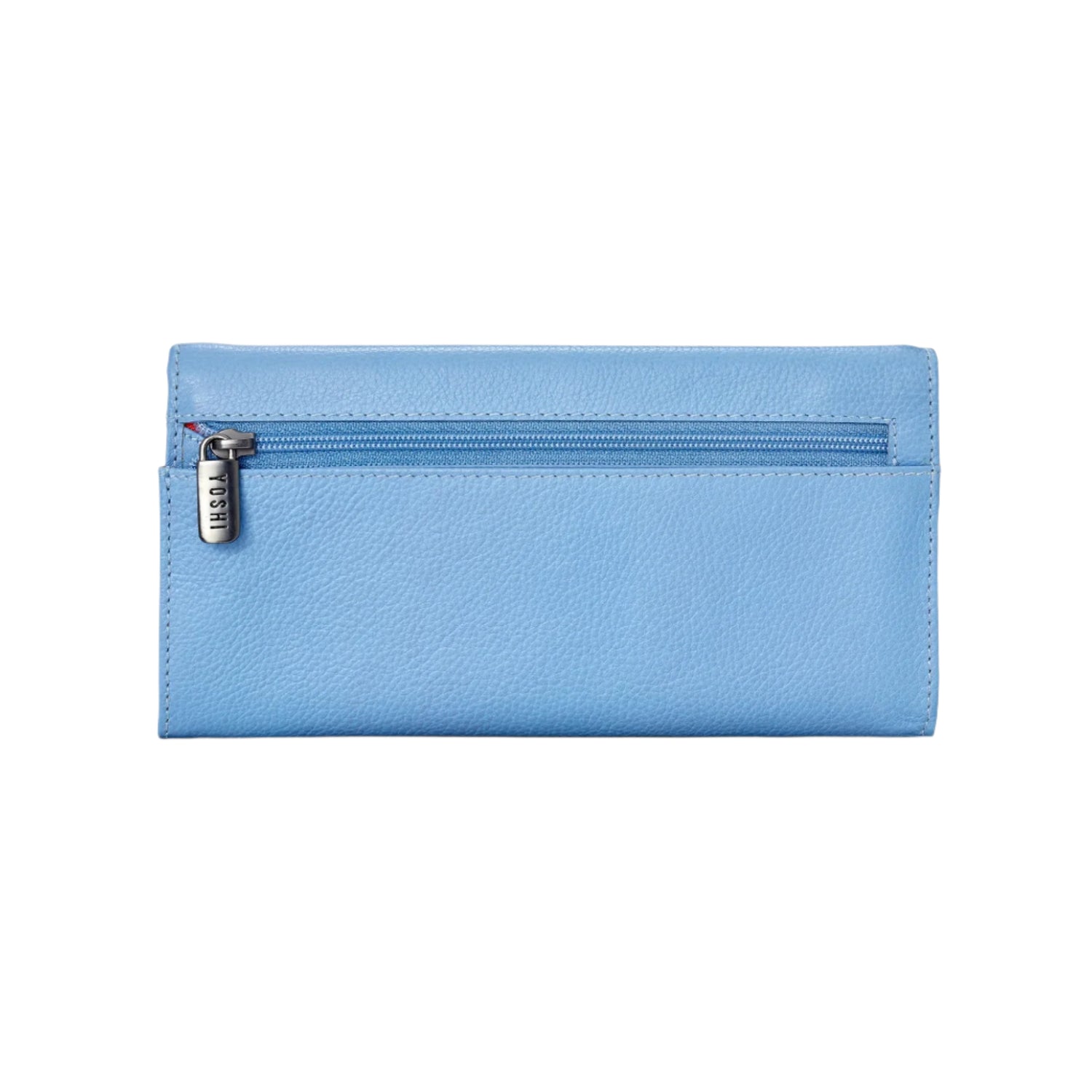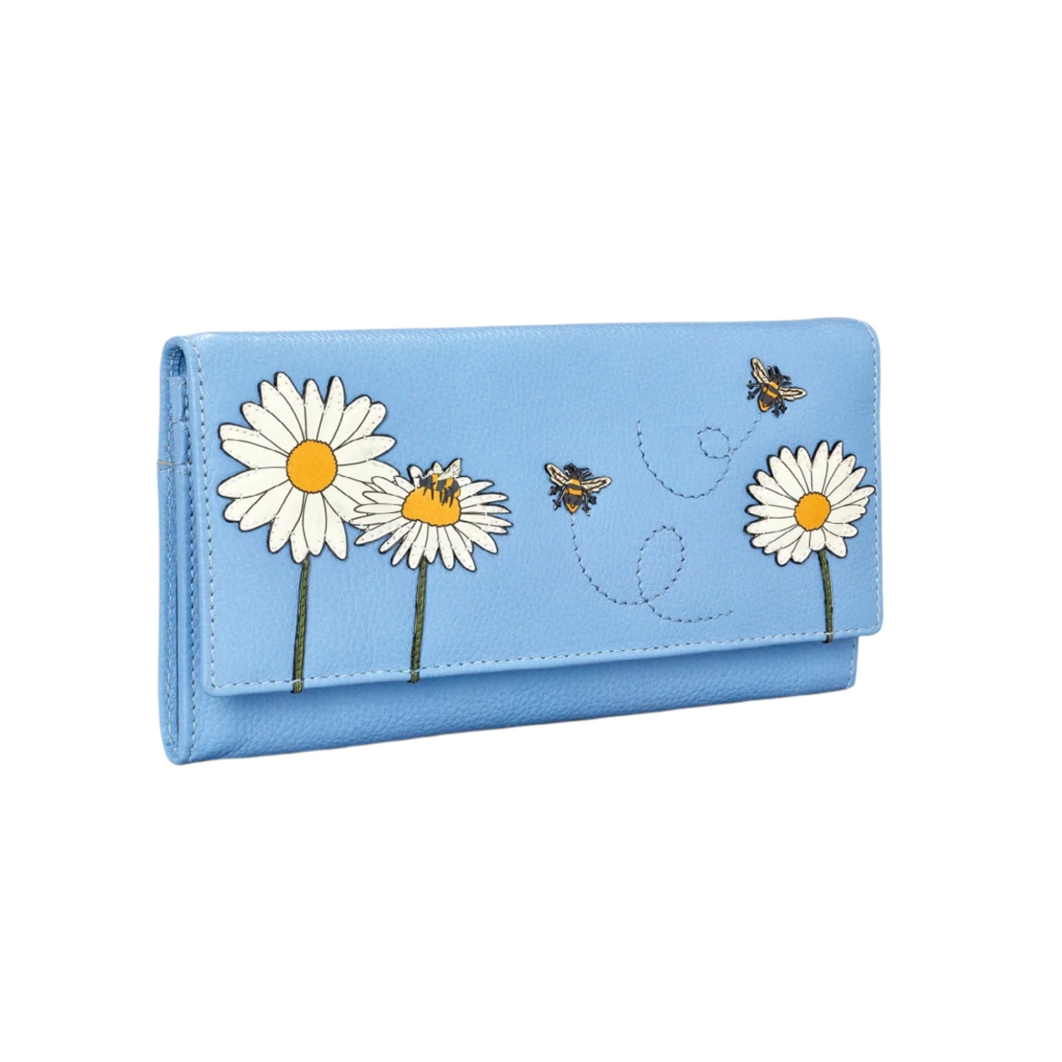 This handmade soft blue leather Bee Happy flap over ladies purse has RFID Protection and features the beautiful daisy flower and bumblebee appliques which have been hand sewn on the front. This womens traditional matinee purse shape fits cards, coins, notes, and also has an ID window.