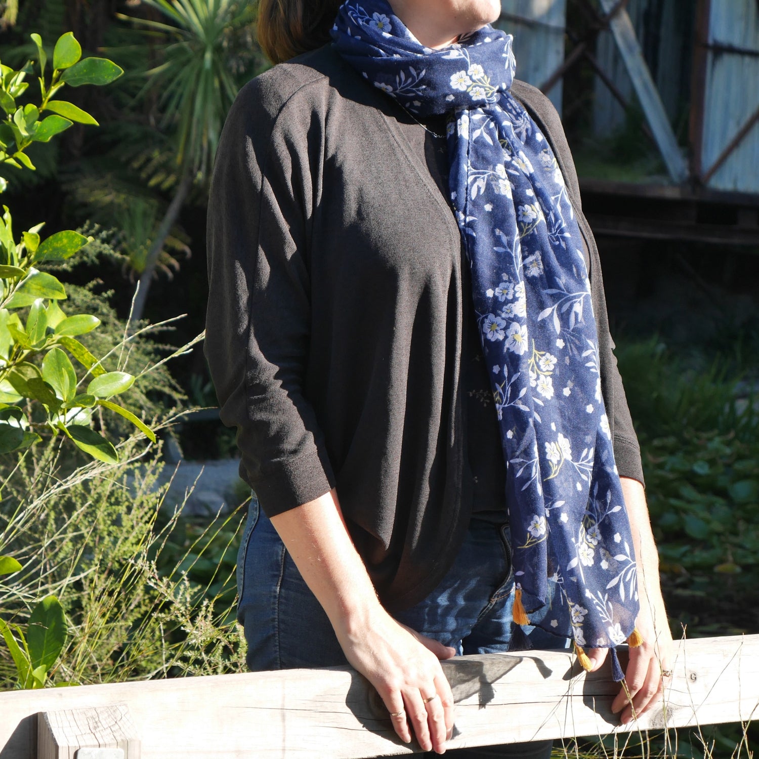 This beautiful scarf is soft and lovely to wear. The design has a lovely mix of White Flowers with a yellow centre and white leaves on a dark blue background. The scarf also has yellow and dark blue tassels.