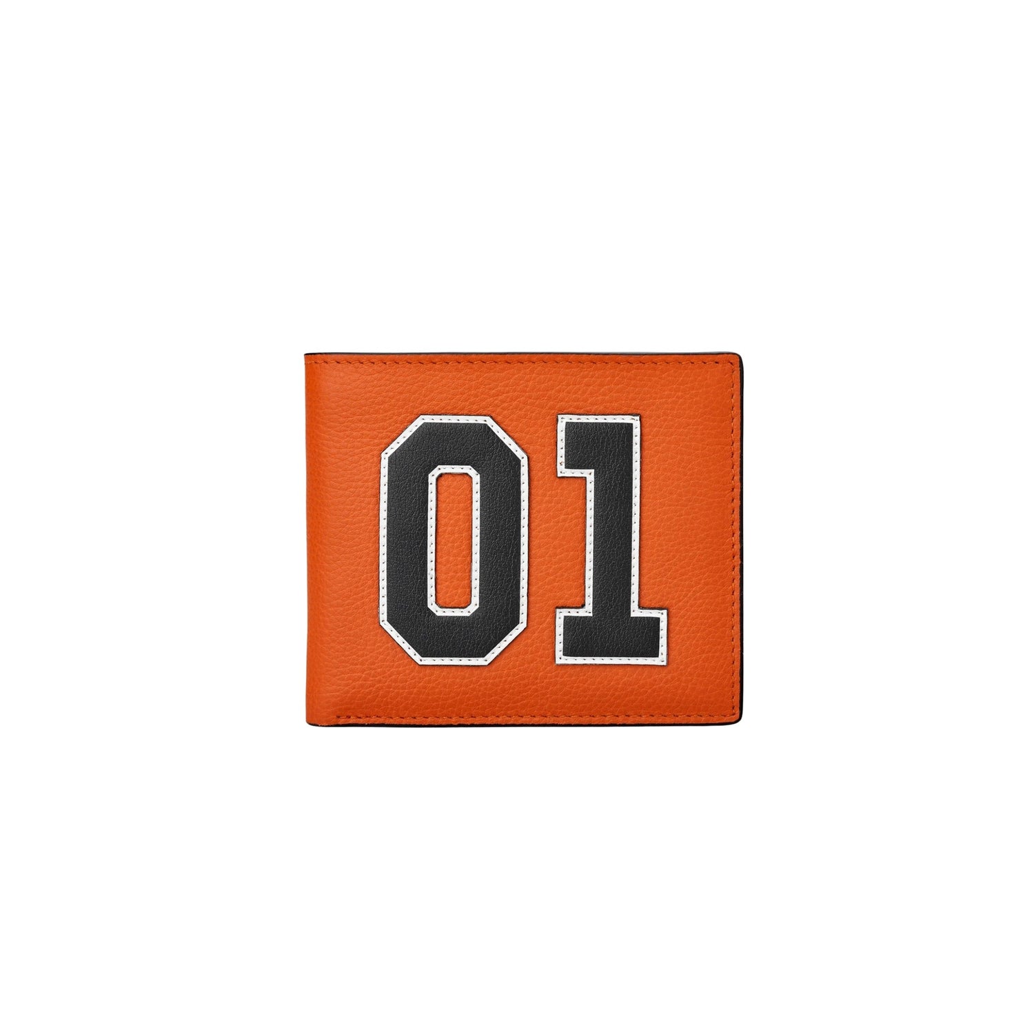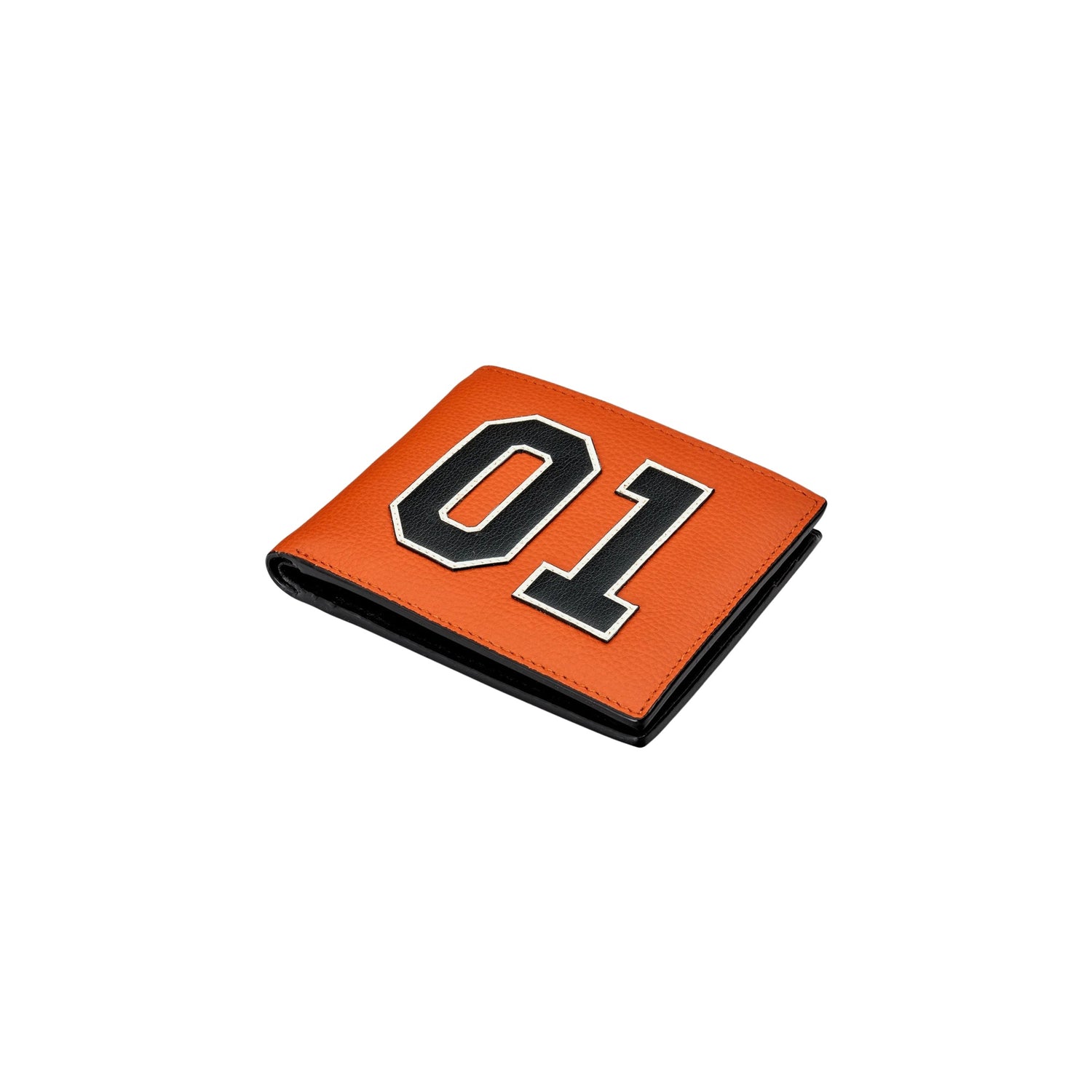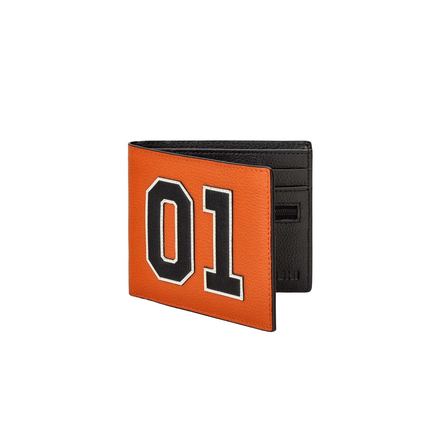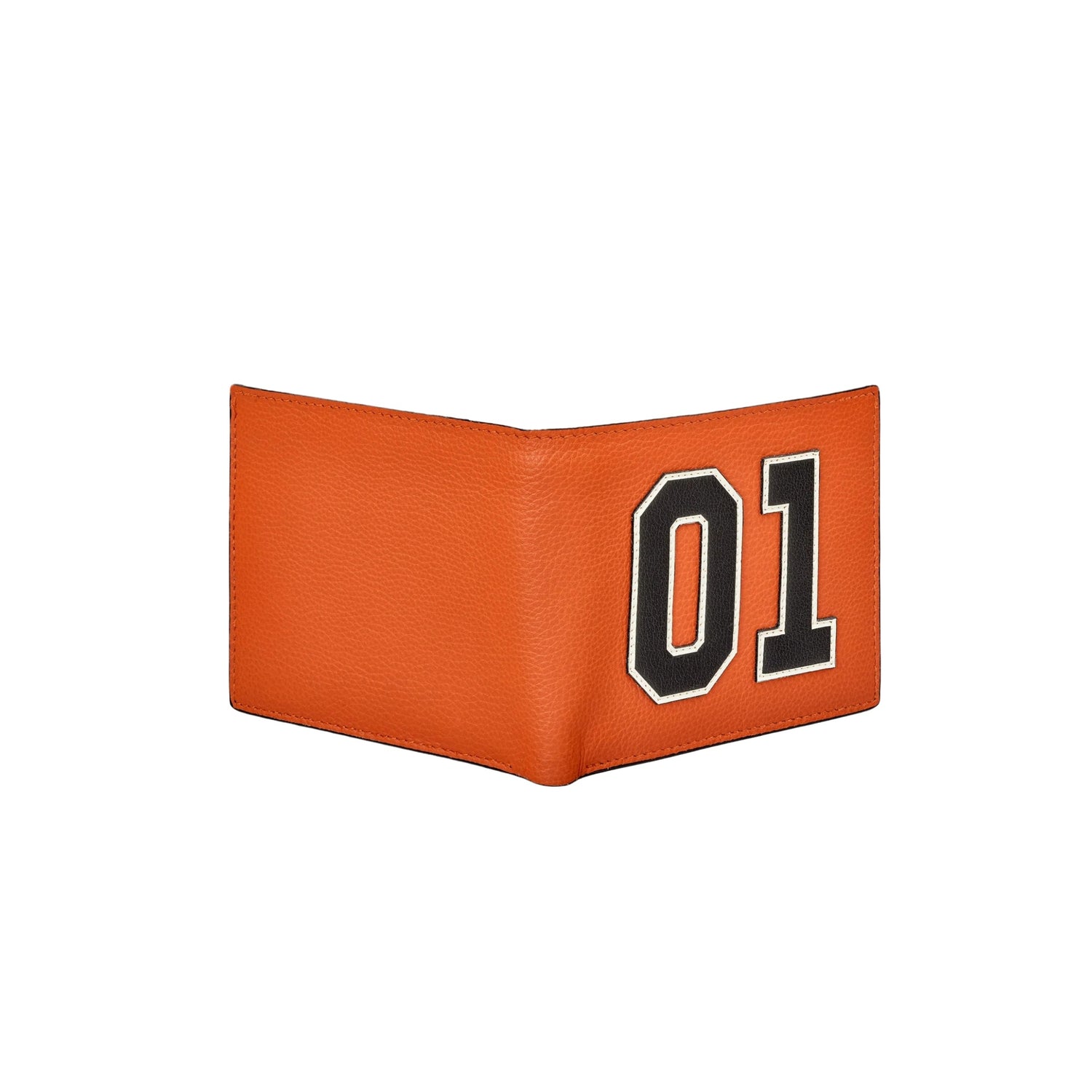 This mens leather two fold leather wallet from Yoshi Goods pays tribute to the iconic tv star car 'The General Lee' with its 01 applique on the front. This bifold design has RFID Protection, card slots, note section, and inner zip pocket. The orange outer and contrast black inner makes it really eye catching.