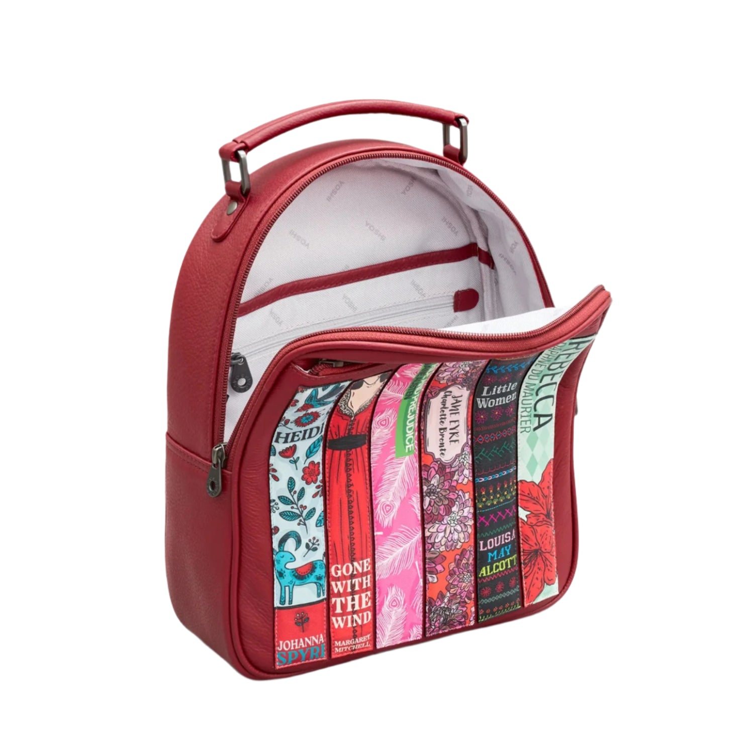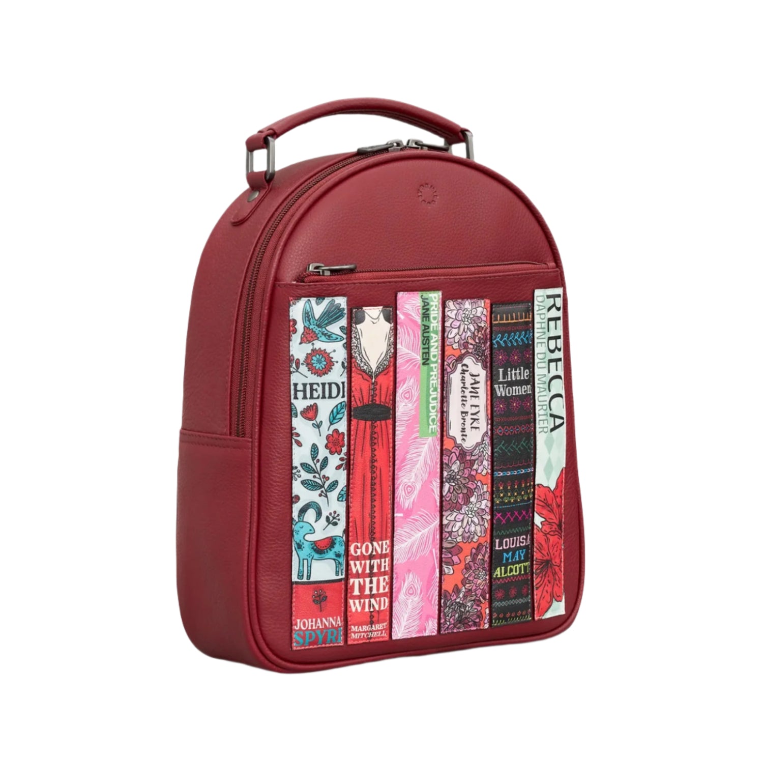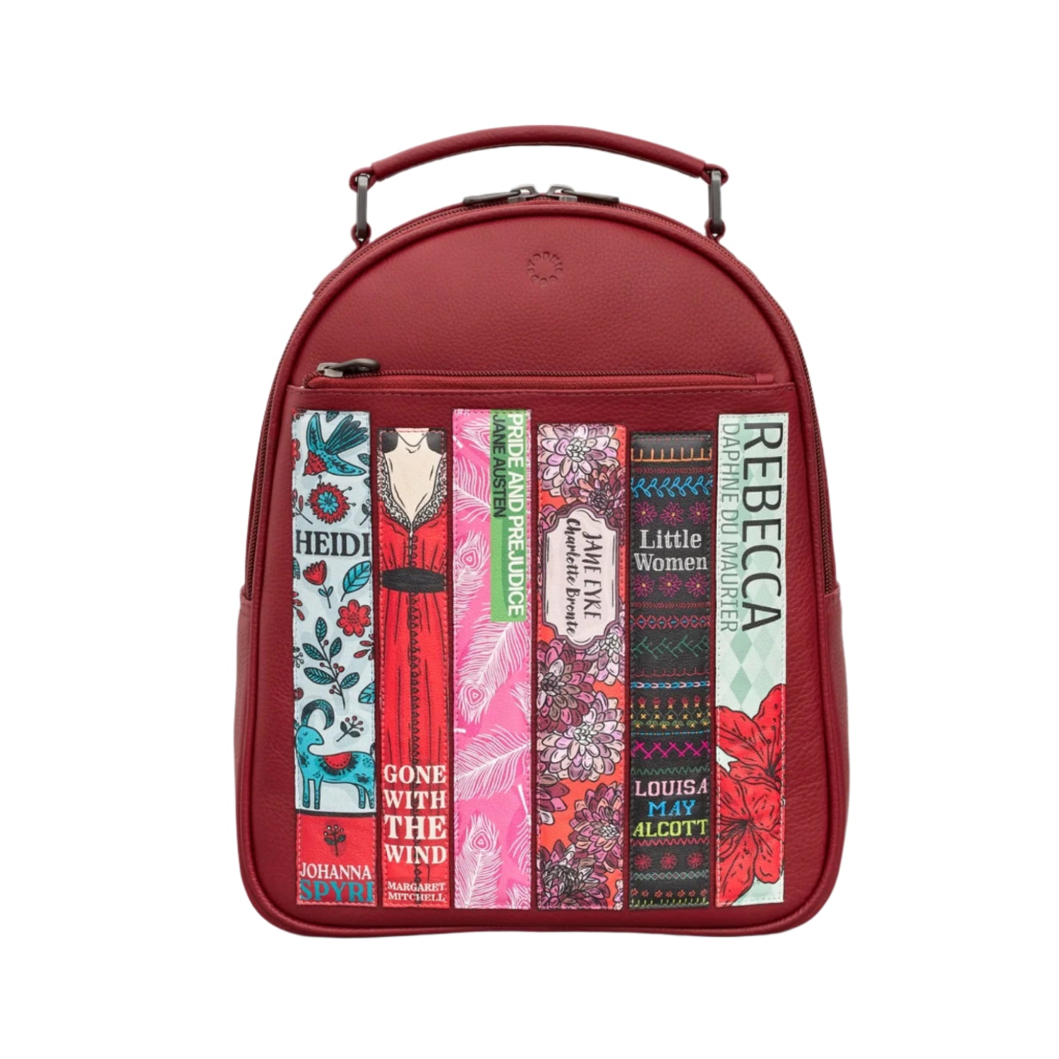 The books on the front of this cherry red Bookworm ladies backpack from Yoshi Goods are detailed appliques and celebrate the work of famous female authors. This style is perfect for bookworms and has two comfortable shoulder straps and lots of inner storage space and pockets as well as an outer zip pocket.