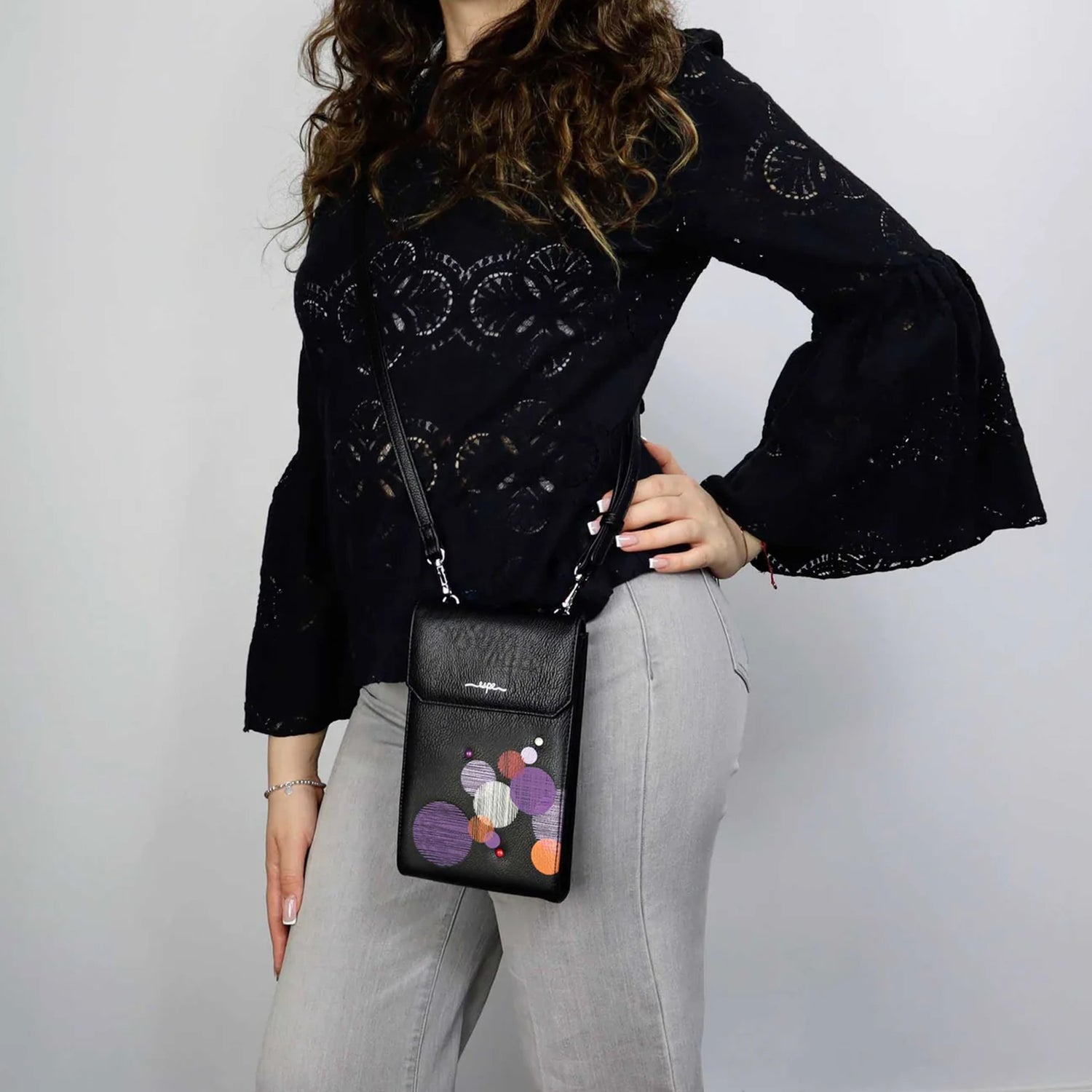 The Cosmos iMini is a great crossbody travel companion! The front flap opens up to a spacious phone compartment and the back zipper compartment has room for 10 cards. And of course this comes with a colourful graphic design that is so unique we guarantee compliments!