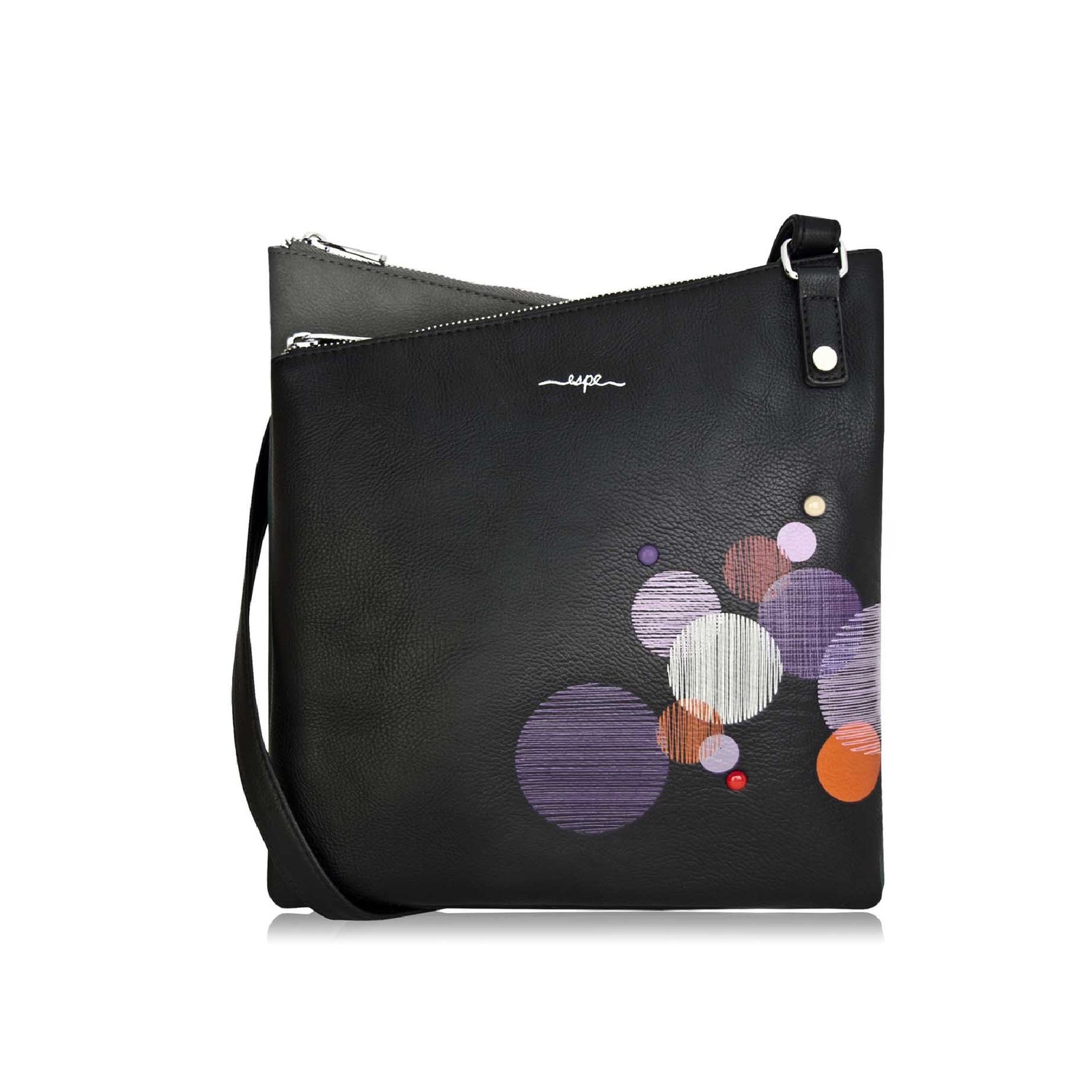 The Cosmos messenger bag has a practical multi compartment design with a unique circular graphic applique. This is the bag you need to bring your some colour to your wardrobe