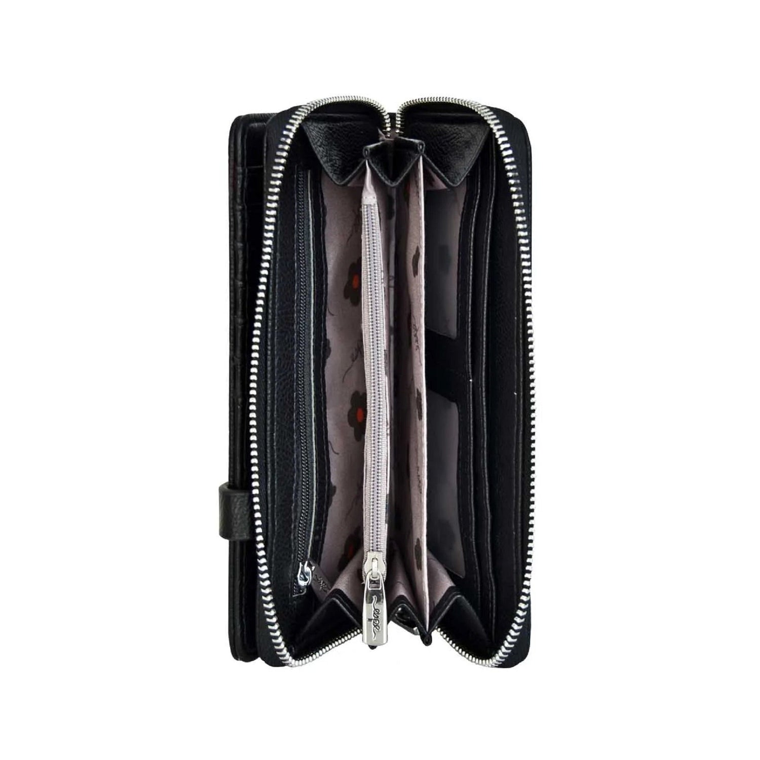 - The main zip around compartment has 2 window card slots, 2 zippered change compartments and 4 spacious compartments for notes, lippy or phone