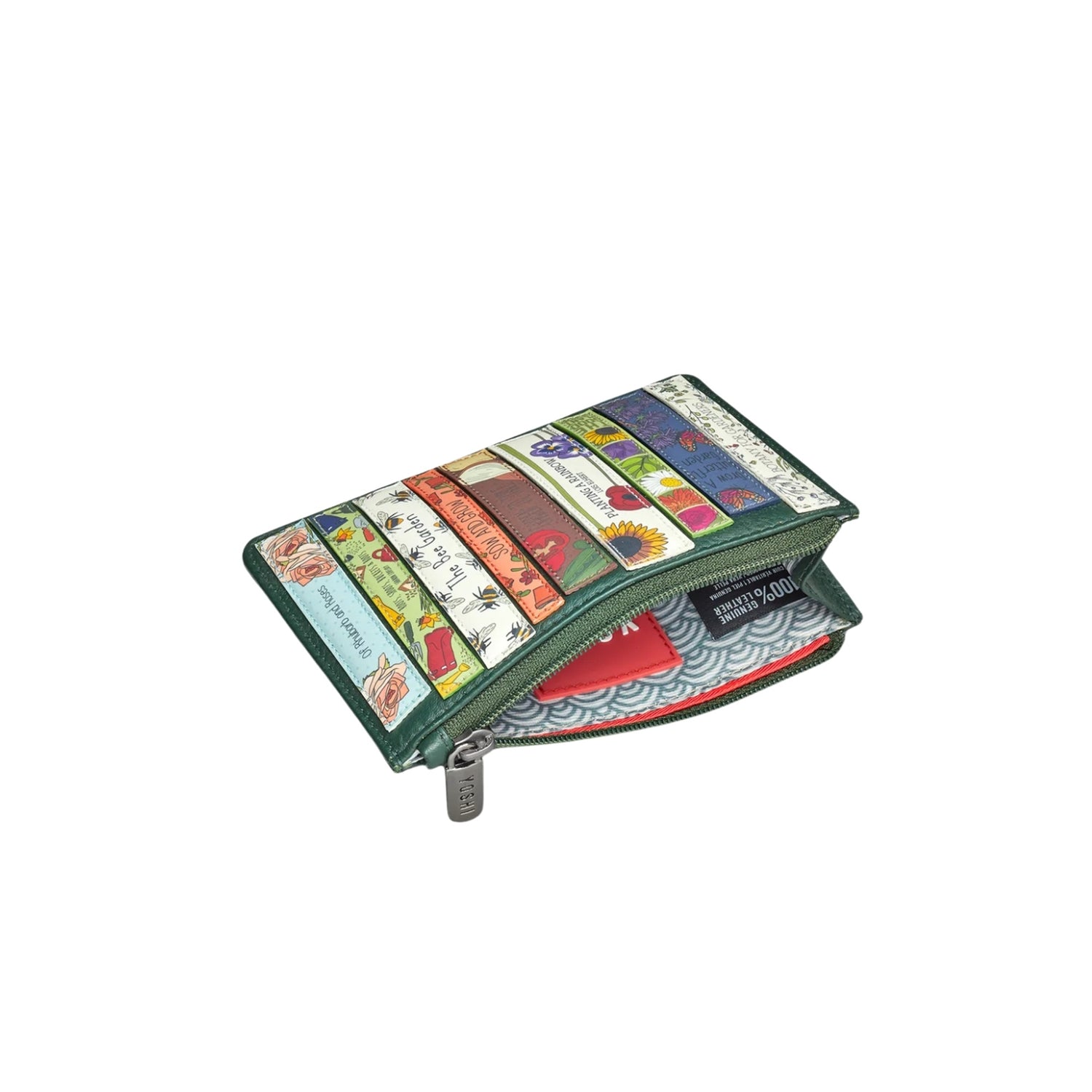 This gardening themed ladies leather purse from Yoshi Goods has RFID Protection and is a slimline design with zip top fastening which fits perfectly in any bag or pocket. From our Green Fingers Bookworm range features handcrafted garden book appliques on the front and fits cards, folded notes, and coins on the inside. There is also a back outer card slot for your most used debit / credit or travel card etc which is really useful.