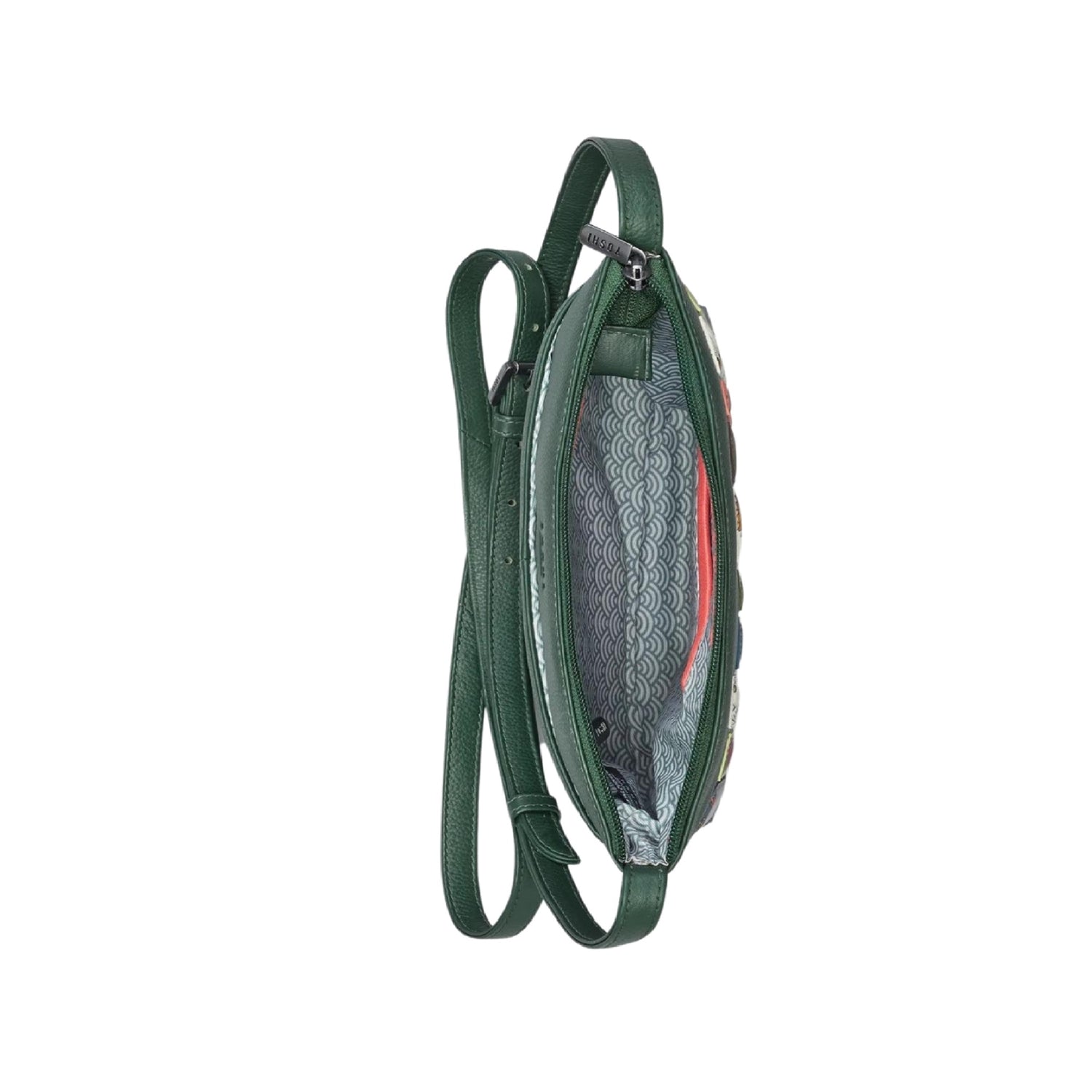Gardening fans will love this supple leather ladies cross body bag that features garden book appliques that have been lovingly hand-stitched onto the front. This Yoshi Goods women's leather across body handbag has an adjustable strap, zip top fastening and back slip pocket.