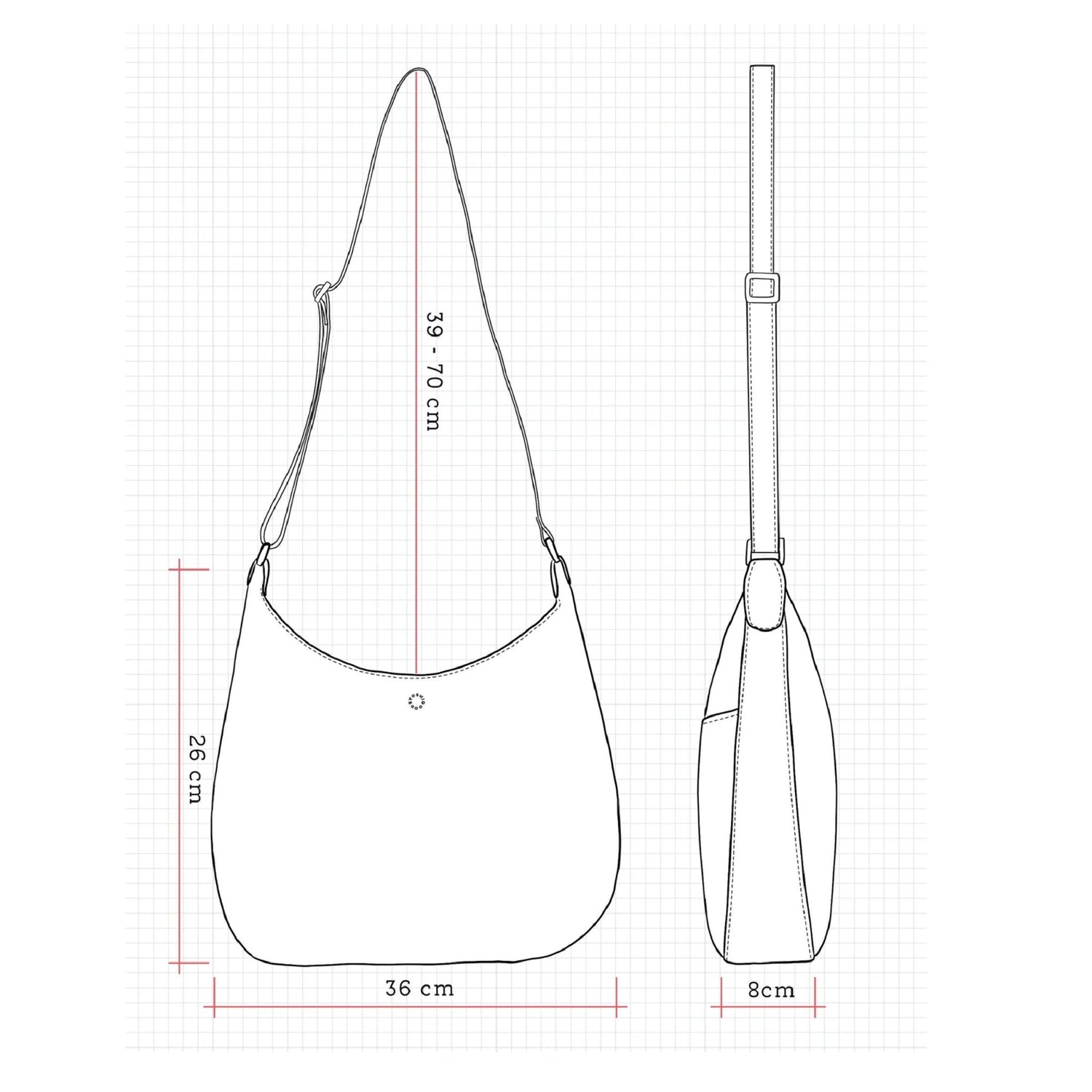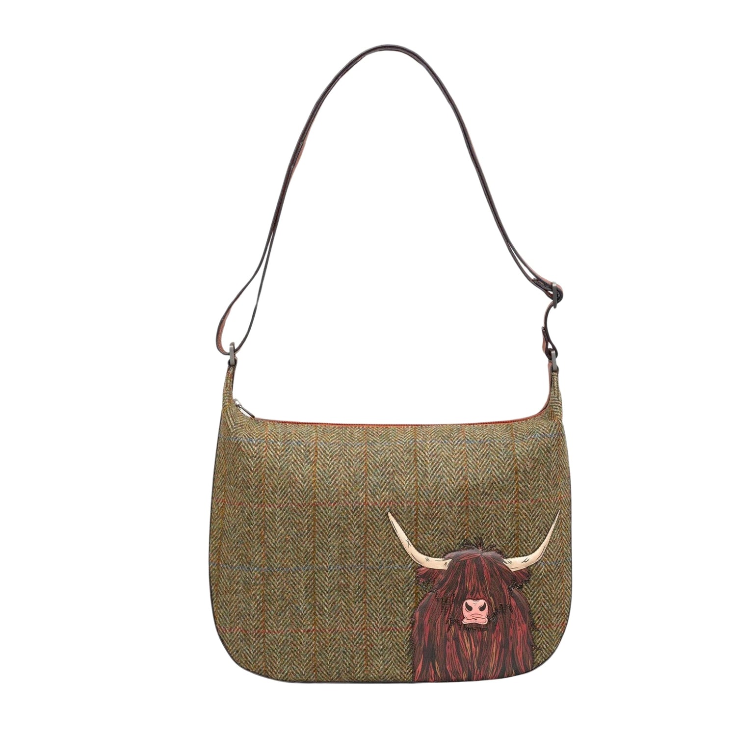 A classic coloured highland cow sits on top of the tonal Harris Tweed fabric background on this women's leather hobo bag from Yoshi Goods. The slightly rustic brown leather then adds a further contrast. This cross body bag for women can also be worn over the shoulder and has a slightly slouch construction and there is plenty of room inside the zipped main section.
