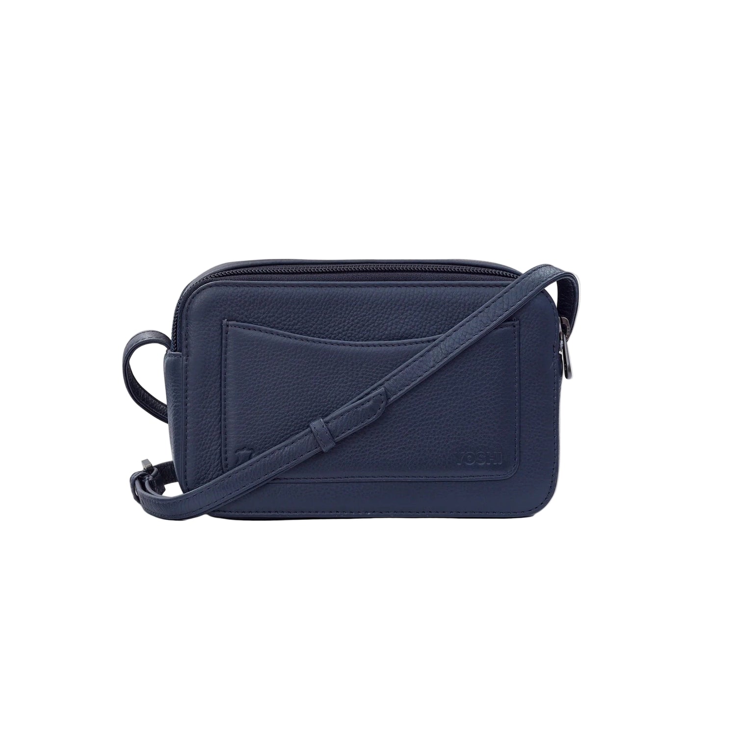 Our Jane Austen navy leather Porter cross body bag is from our Bookworm collection and is a compact double zip top style. This ladies handbag has lots of inner space for your essentials and a detailed applique book spine design on the front.