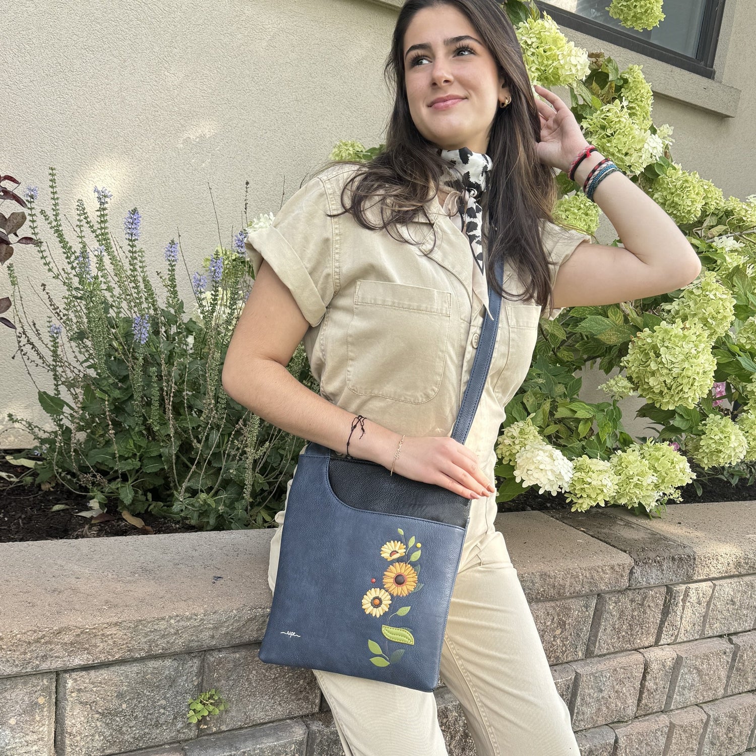 This unique crossbody bag is adorned with a bright summer floral applique. The Joyful crossbody is as functional as it is pretty – with multiple pockets and a zip top. With an adjustable strap this bag great for everyday.
