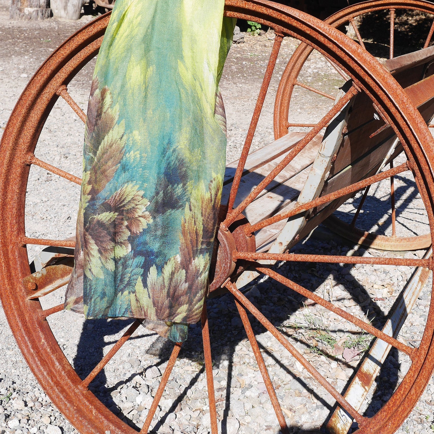 This beautiful scarf is soft and lovely to wear. The design is of a lovely mix of bright and dark green with a touch of brown in the branches and leaves of the feature plant.