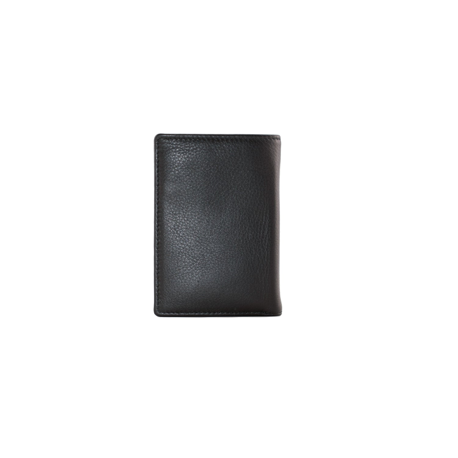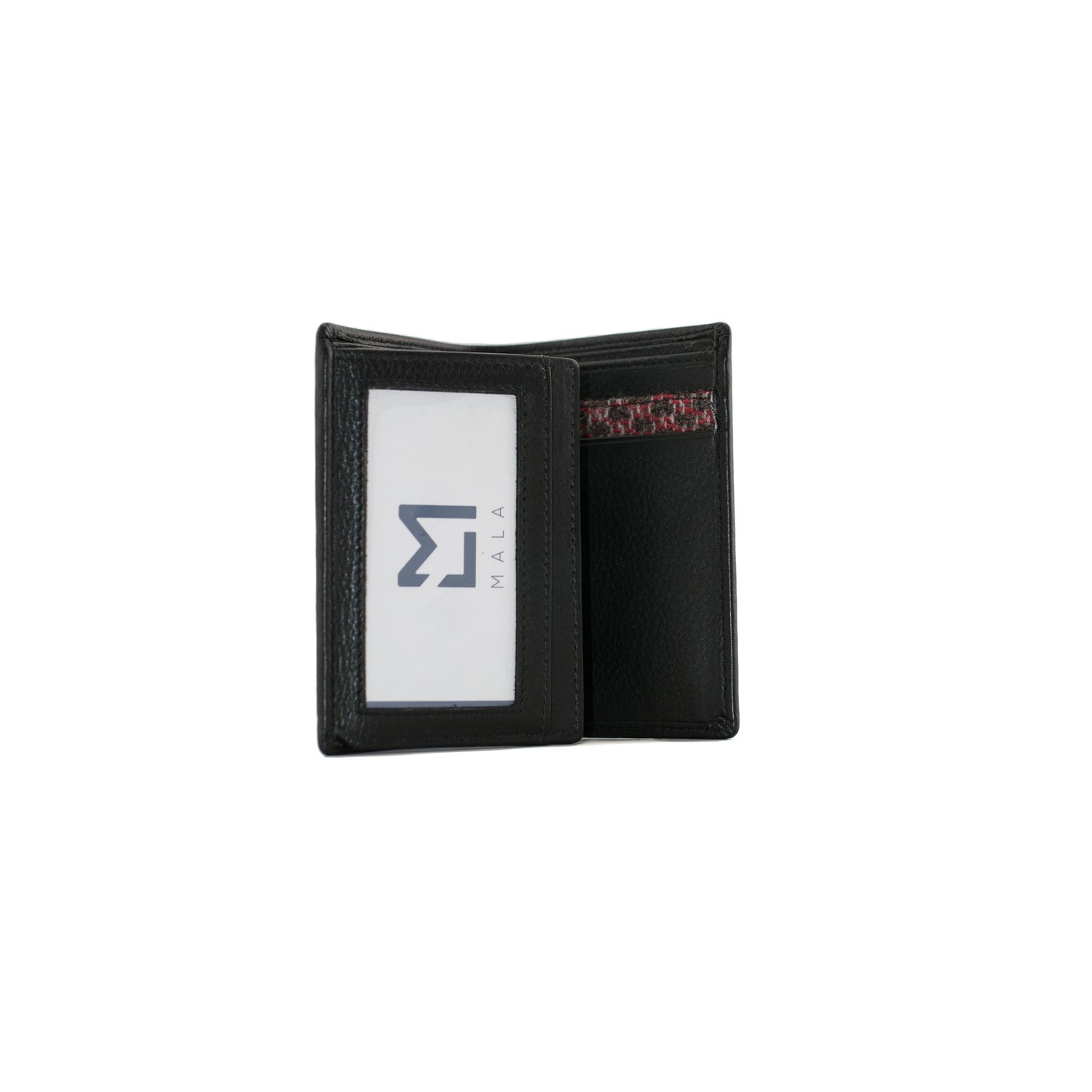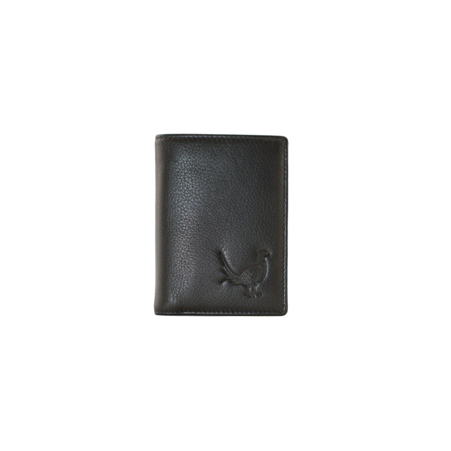 Slim black leather wallet with an embossed pheasant logo, combining style and practicality in a compact design. Equipped with an ID window, six card slots, two note pockets, three hidden slip pockets, and showcasing a stylish fabric trim.