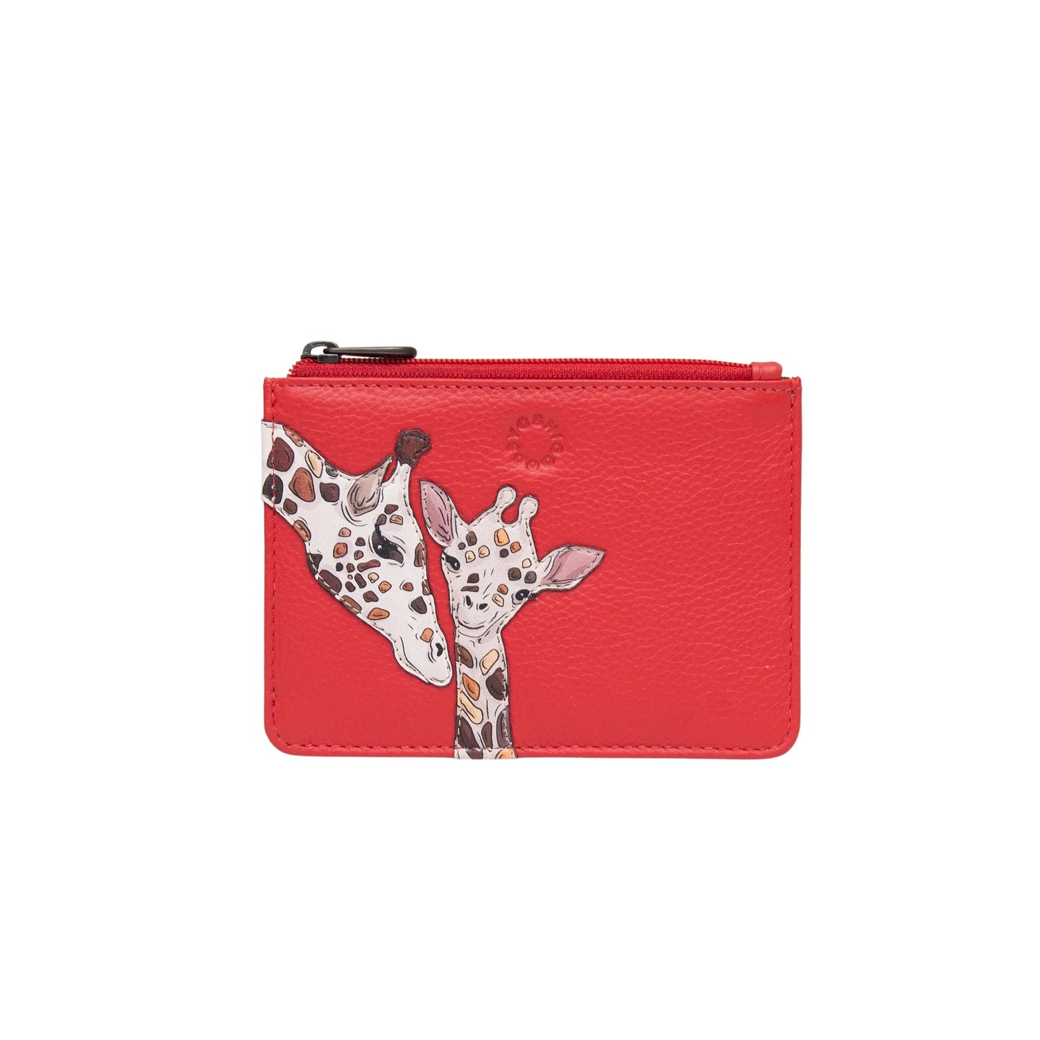 This Yoshi Goods Mothers Pride zip top red leather purse with giraffe applique design has RFID Protection and two useful back outer card slots.
