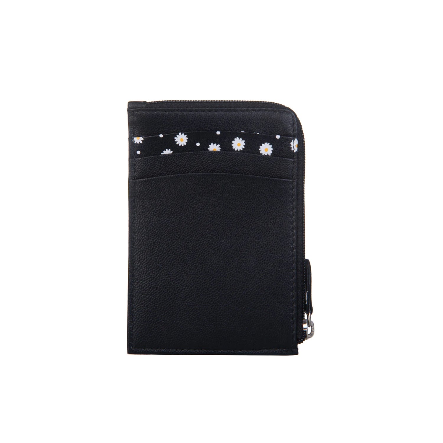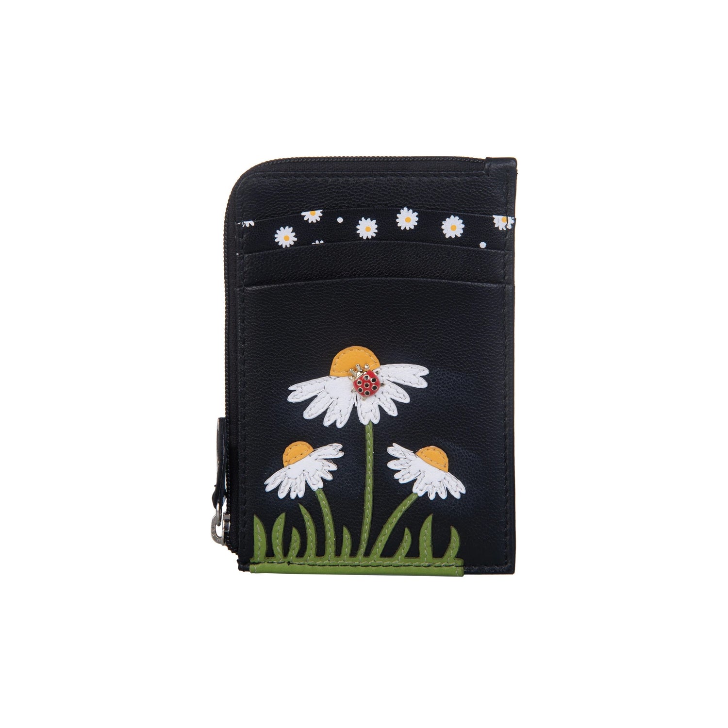 This slim and compact coin/cardholder from Mala Leather is ideal for very small bags or to fit into your pocket. The outer holds 6 cards and the curved zip allows easy access to your loose change. Decorated with beautiful leather appliqued flowers and metal ladybird fitting.