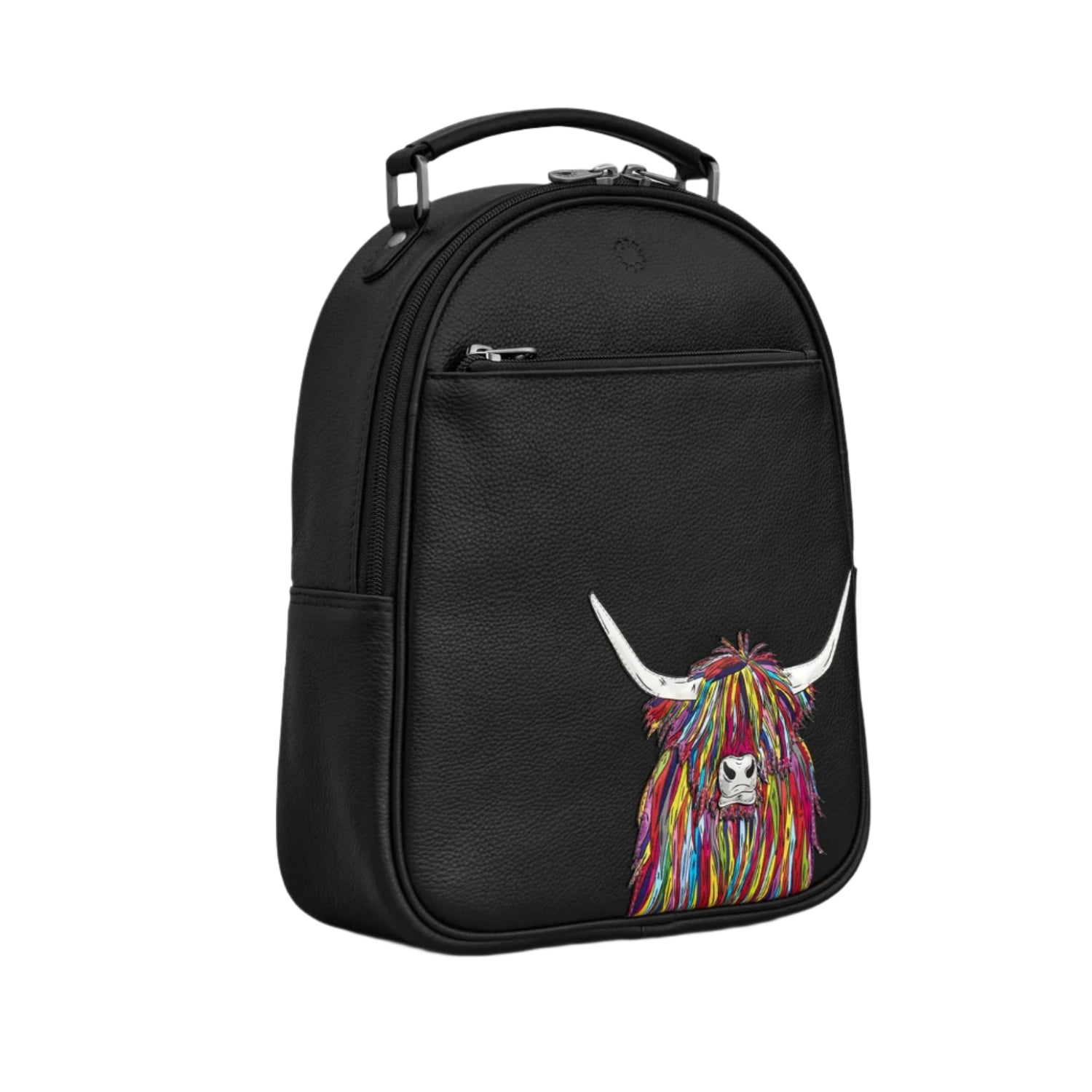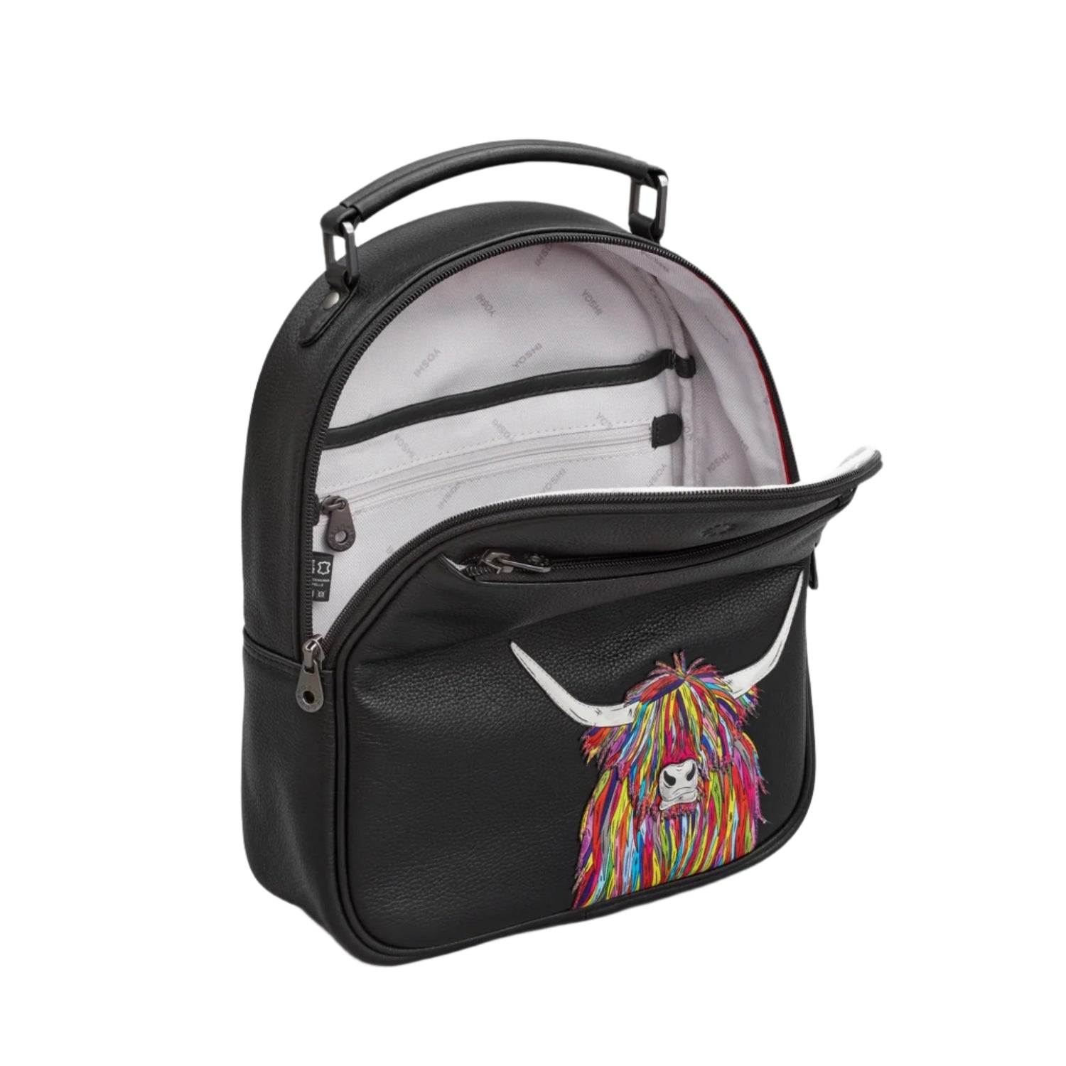 A rainbow coloured highland cow pops against the stark black leather on this women's leather backpack. The black leather background then adds a further contrast. This backpack from Yoshi Goods has lots of storage space and pockets inside as well as a useful outer zip pocket.