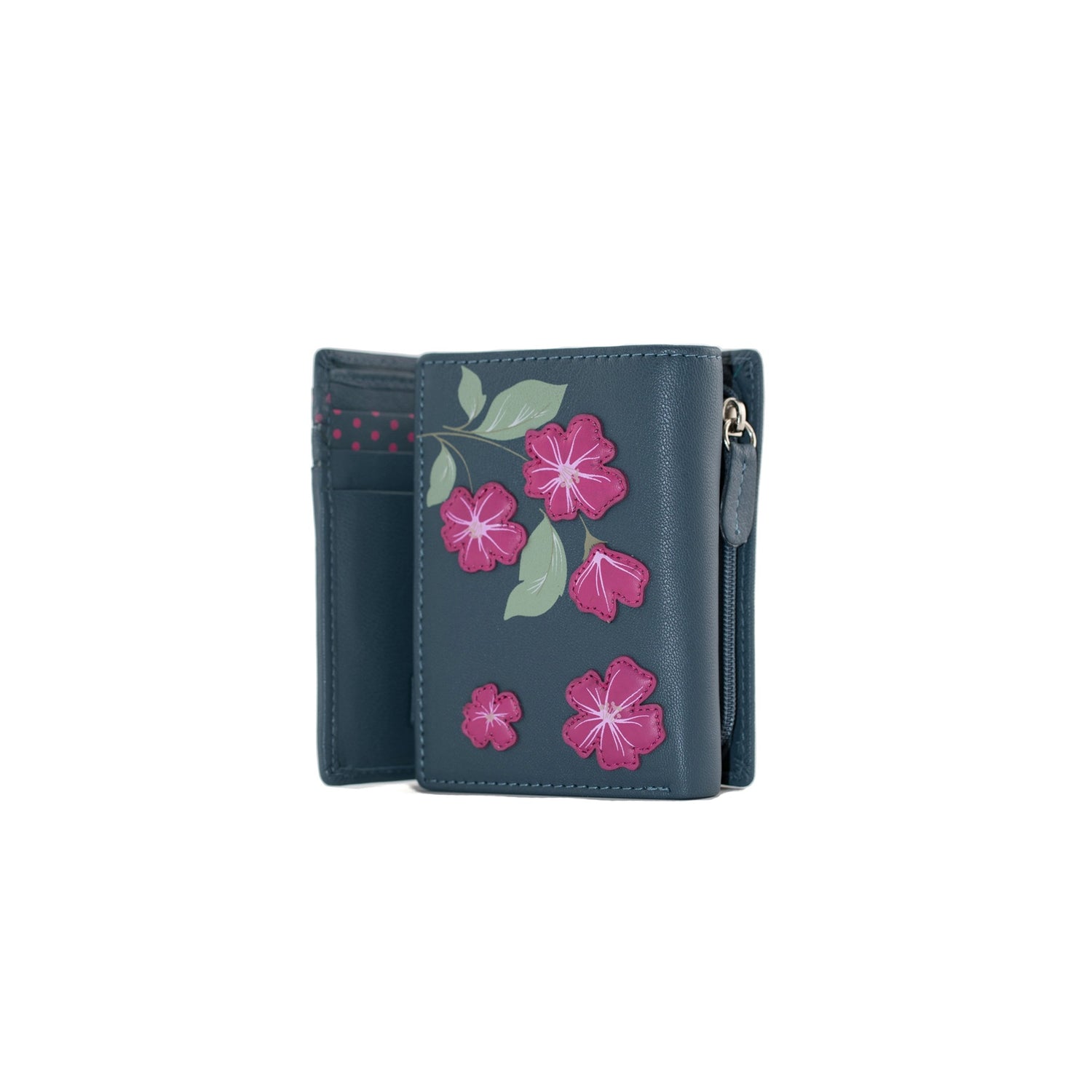 Created from beautiful smooth leather and decorated with flower applique motifs, this handy little purse from Mala Leather is perfect for smaller handbags and has everything you need.