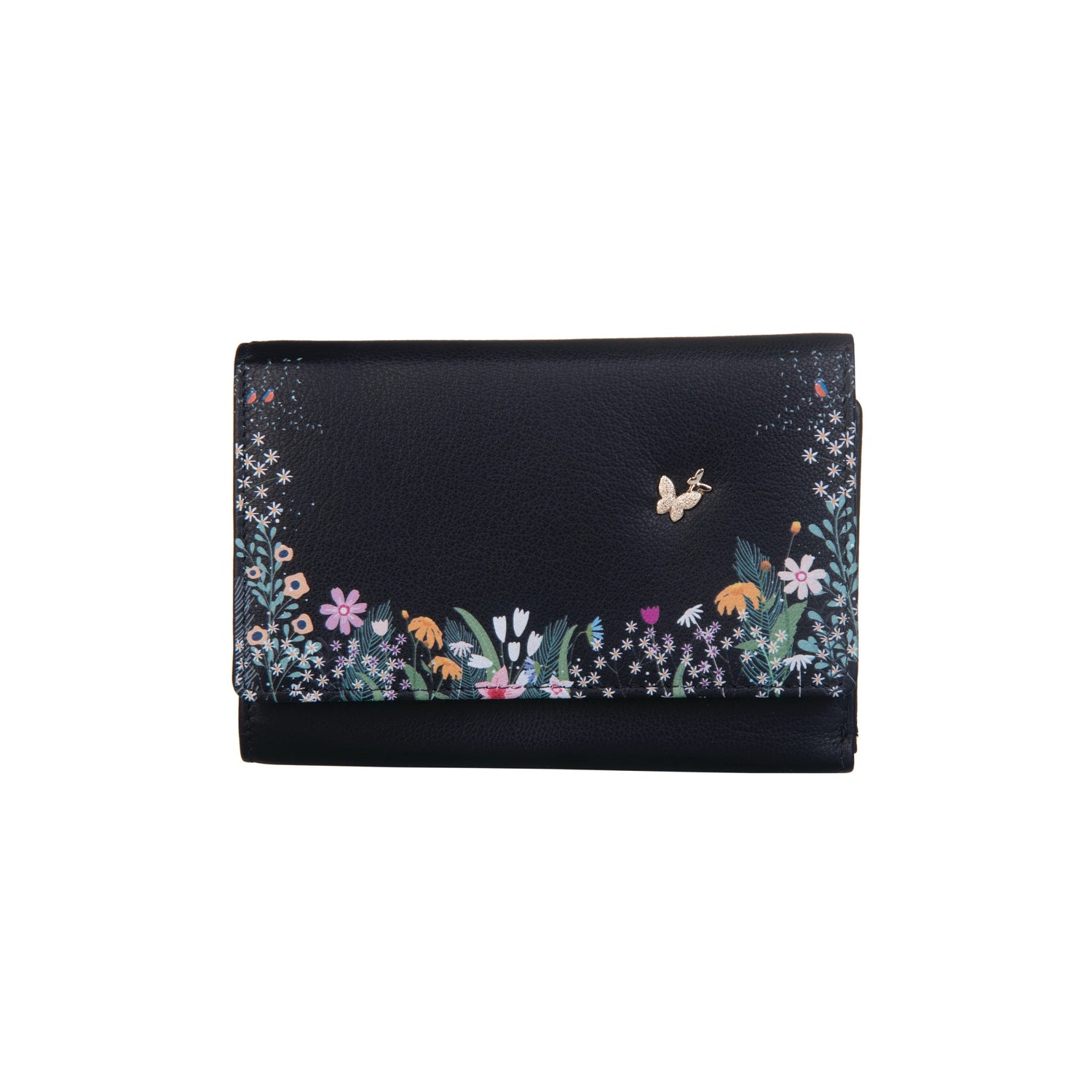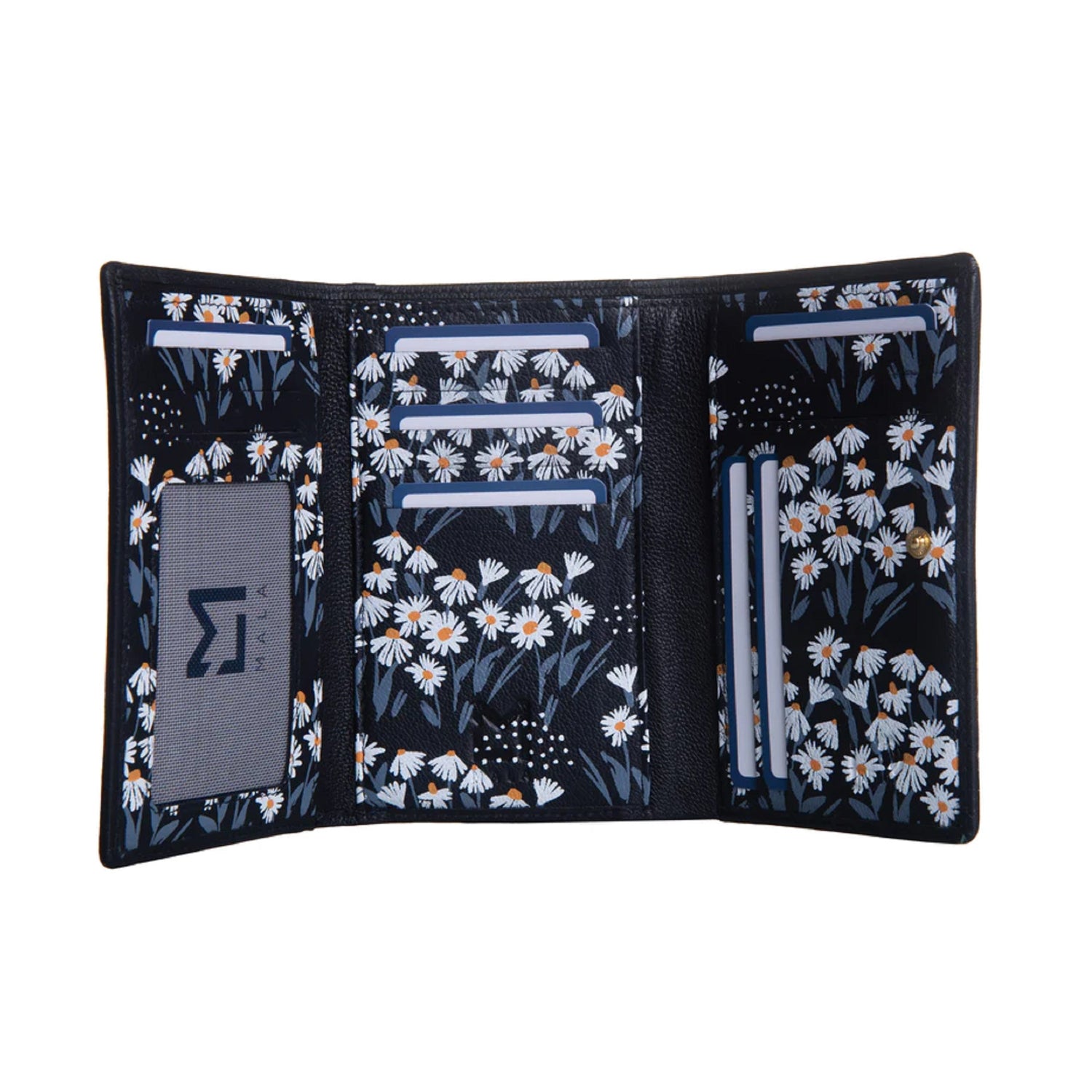 The perfect summer accessory with it's delicate printed flowers and chic butterfly from Mala Leather. This super tri fold purse holds numerous cards, notes, coins and has an ID window for passes. The tri fold section displays your cards neatly and the 3 slip pockets are ideal for receipts.