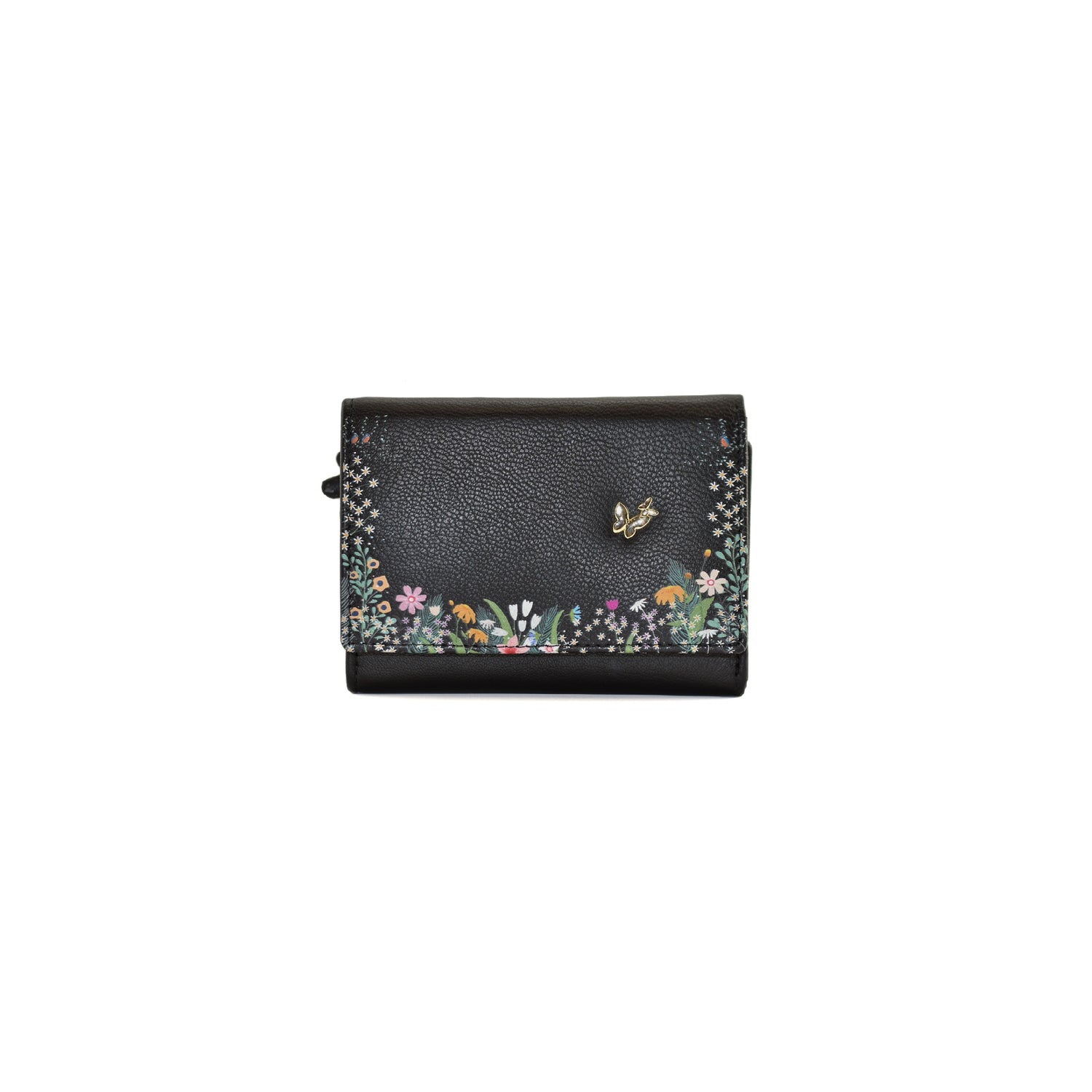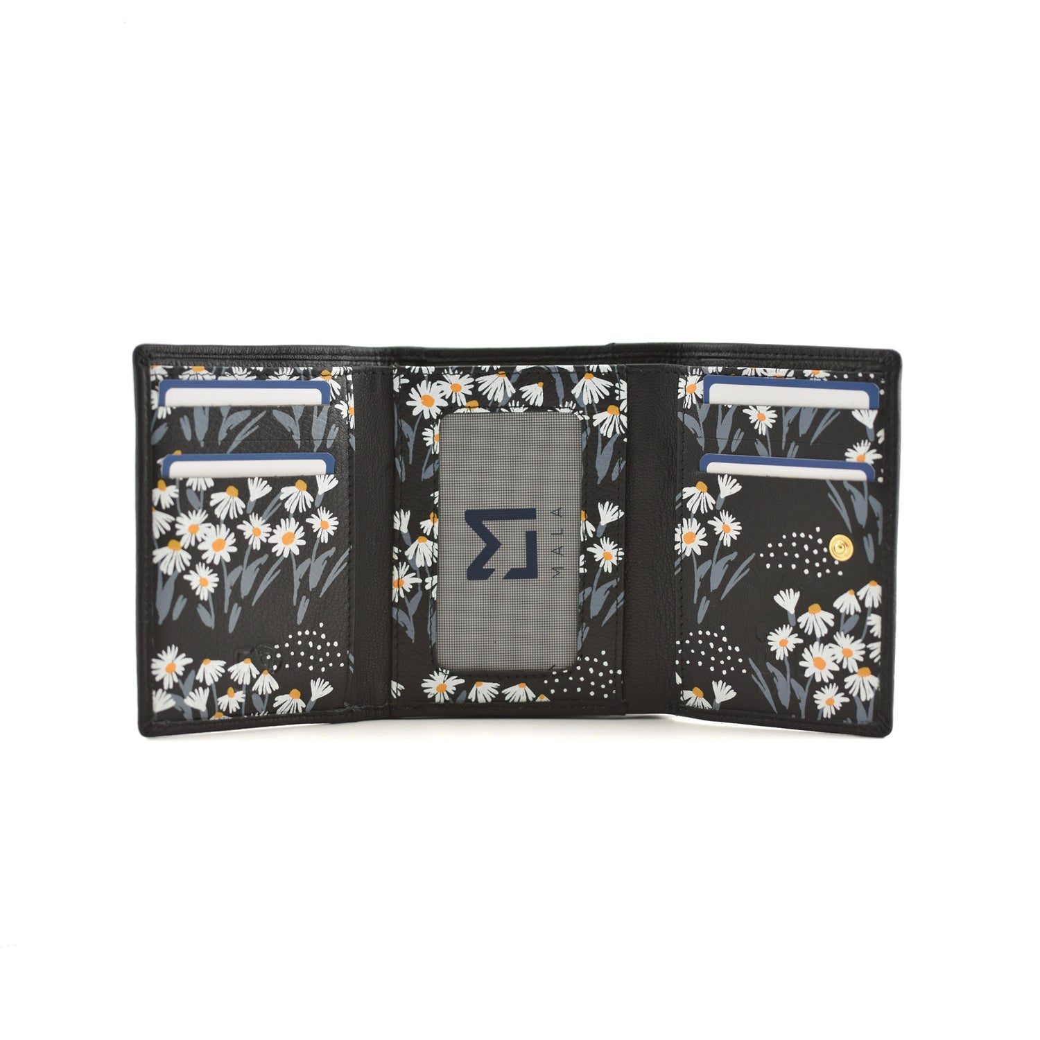 Ideal for smaller bags, this pretty floral tri fold purse from Mala Leather is compact and practical. Handcrafted from genuine soft leather and decorated with printed flowers and delicate gold butterfly fitting.