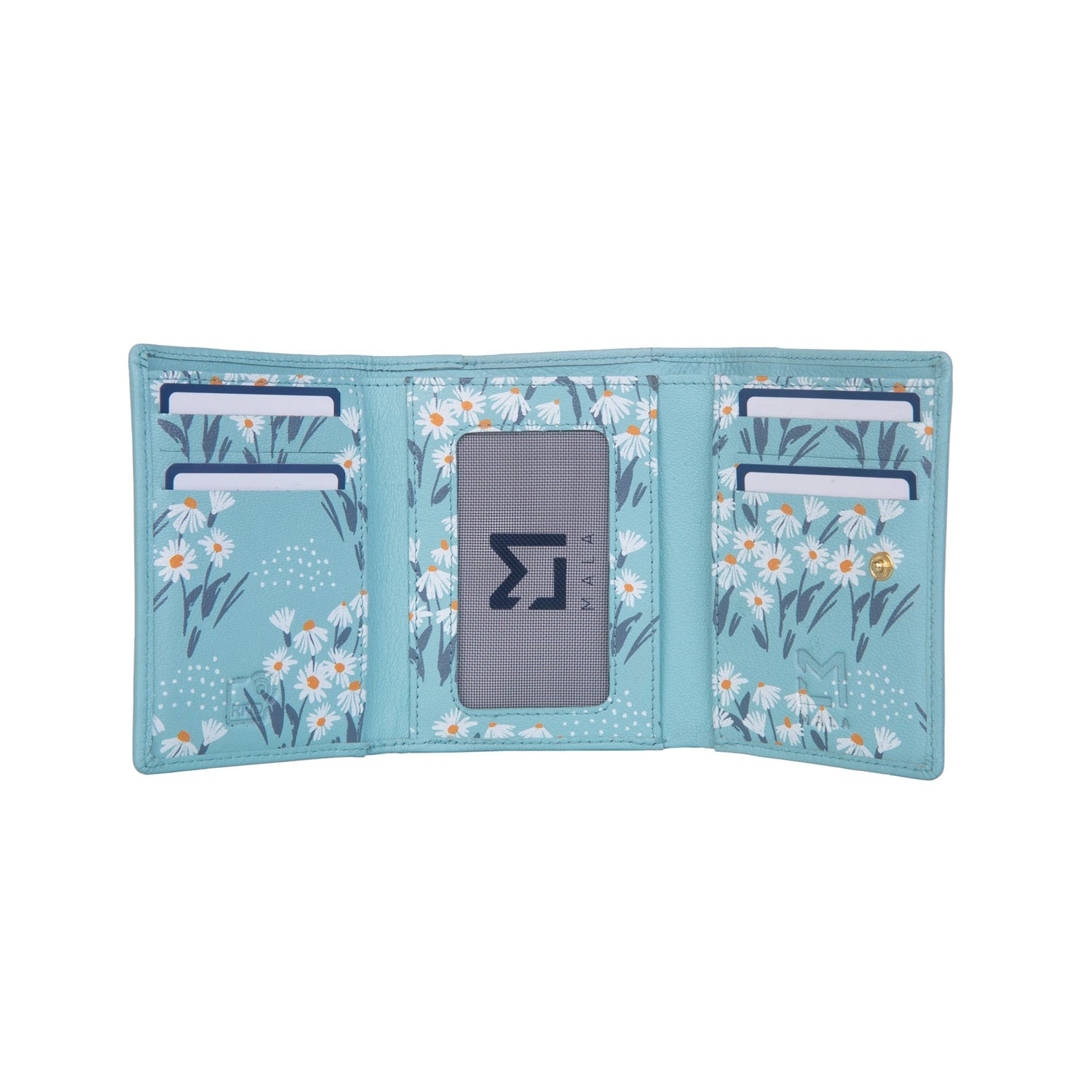 Ideal for smaller bags, this pretty floral tri fold purse from Mala Leather is compact and practical. Handcrafted from genuine soft leather and decorated with printed flowers and delicate gold butterfly fitting.