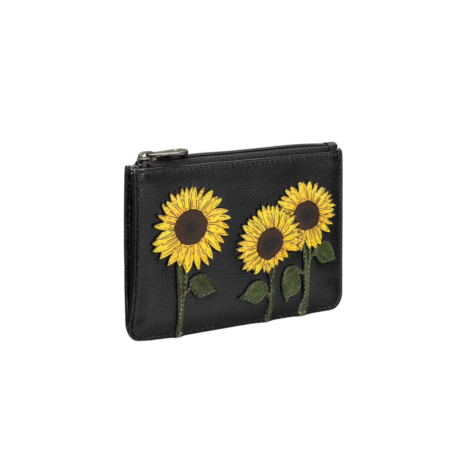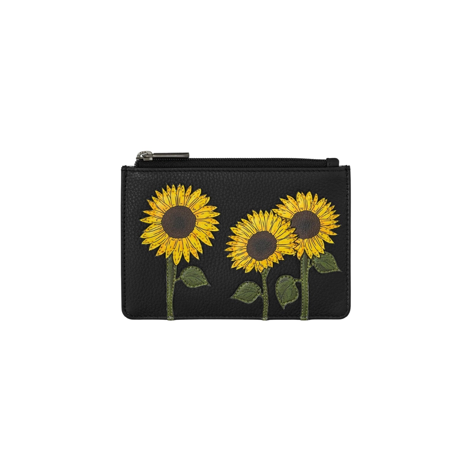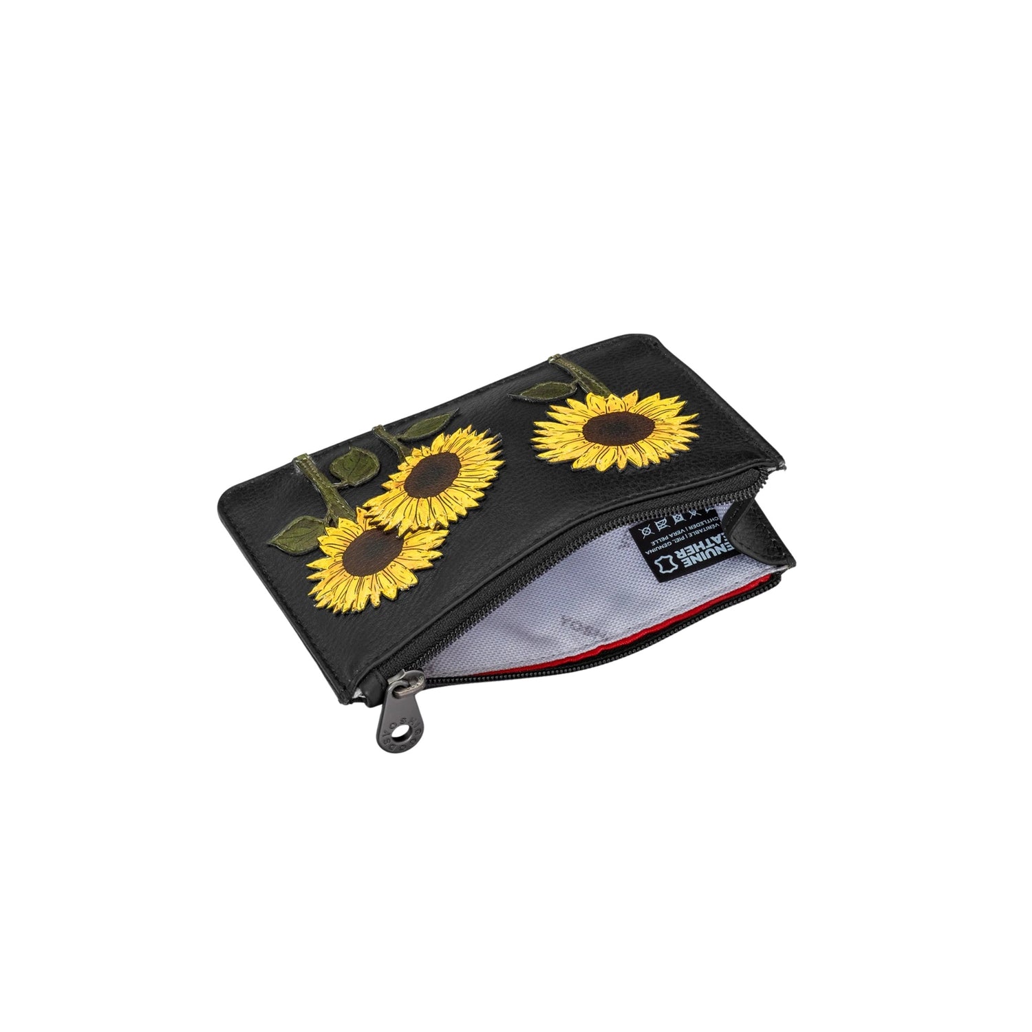 This Sunflowers zip top purse from Yoshi Goods is a lovely handcrafted design with RFID Protection and acolourful Sunflower applique design on the front. This women's slimline design slots nicely into and handbag and has space for cards, coins, and notes on the inside, and there is also a useful back outer card slot.