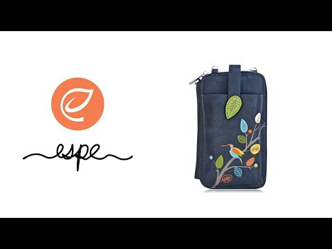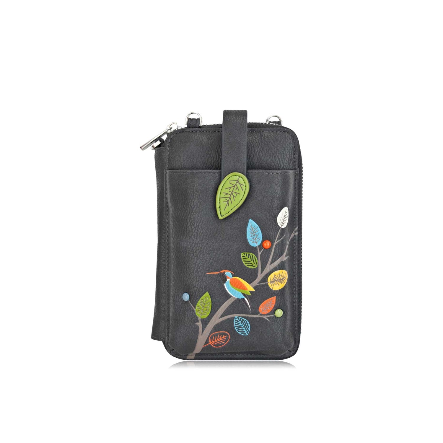 The Sunny Smartphone has a bright, leafy design featuring a colourful bird perched on a branch. The smartphone pouch also has a built in wallet for added functionality and holds a smart phone, cards, and cash.