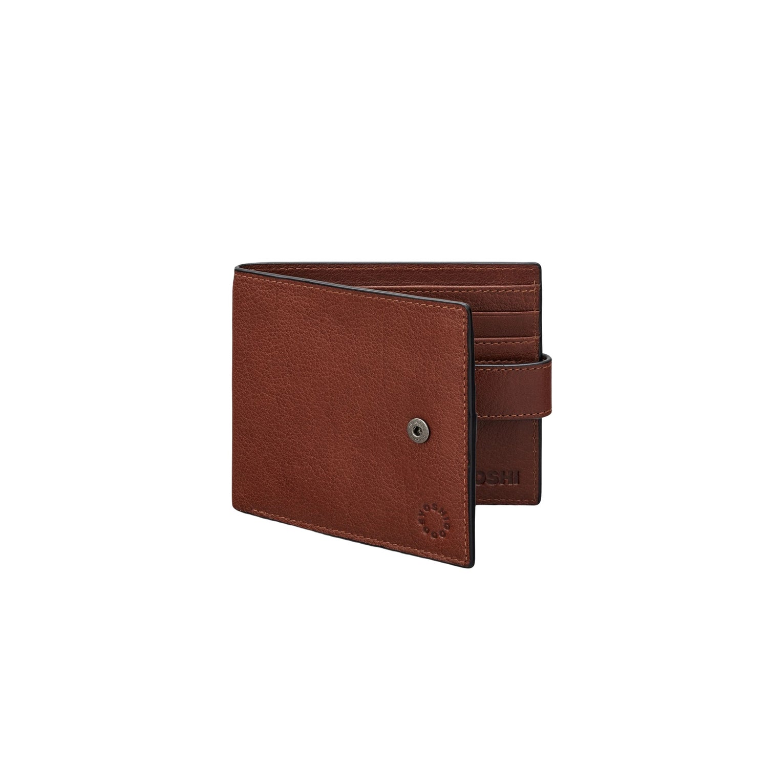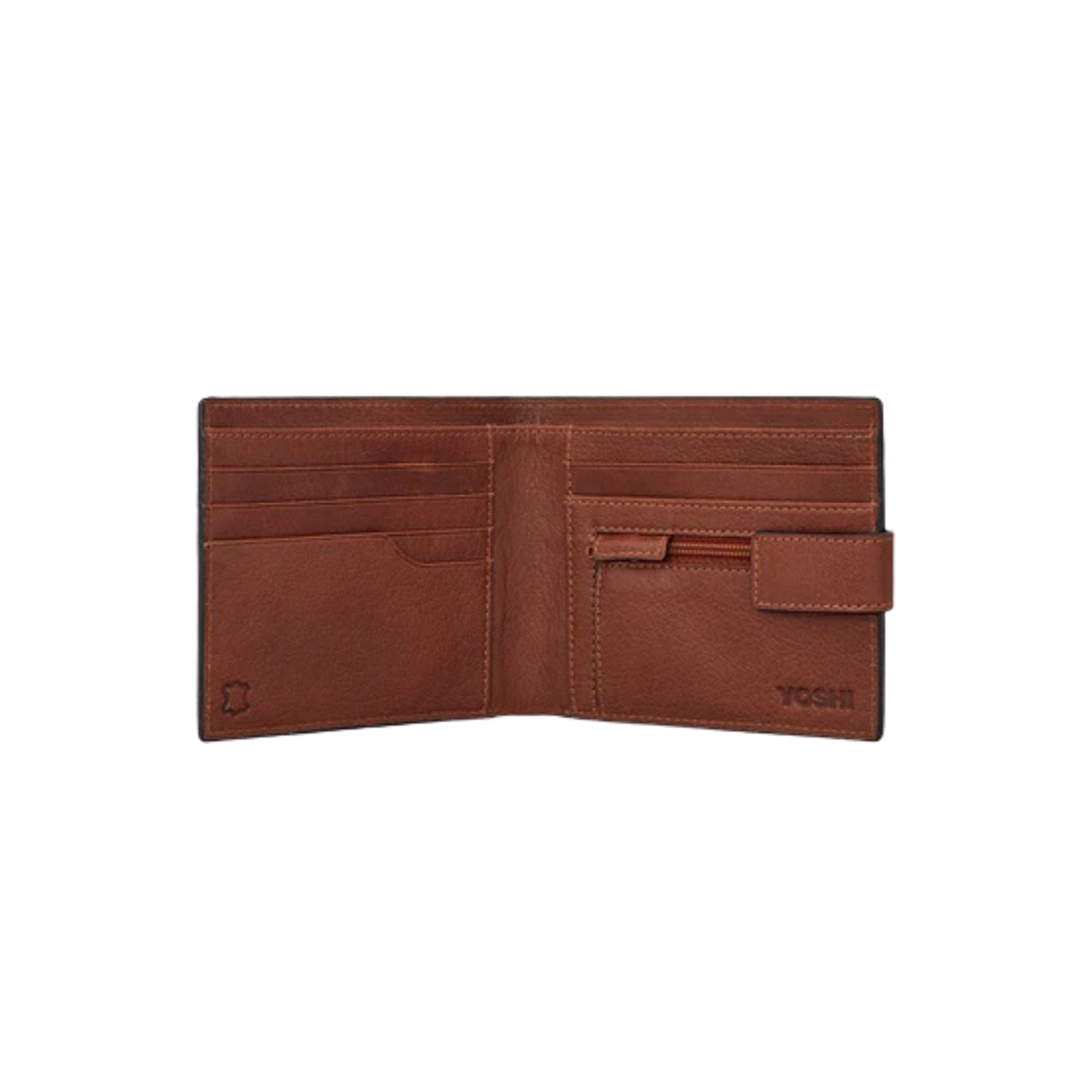 This two fold soft brown leather wallet for men from Yoshi Goods has a tab fastening and RFID Protection. Inside this bi-fold shape there is a note section, zip coin pocket, six credit card slots, and two 'slip' pockets.